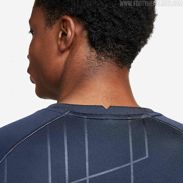 Wie auch beim Auswärtstrikot sind die Logos auf dem Nike FC Barcelona 2021-2022 Auswärts Pre-Match Shirt komplett irisierend. Außerdem sind alle Nähte des Trikots irisierend, was bei Fußballtrikots eine Premiere sein dürfte.