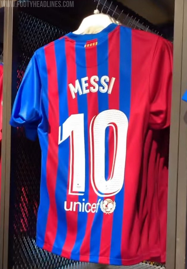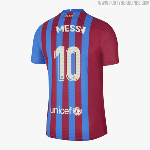 Barcas Trikot 2021-22 kombiniert'Soar / Noble Red / Pale Ivory'. Die blauen und roten Farben sind heller als die des vorherigen Trikots, während "Pale Ivory" ein Off-White ist, das dem Elfenbein ähnelt, dem Material, das aus den Zähnen und Stoßzähnen von Tieren hergestellt wird.