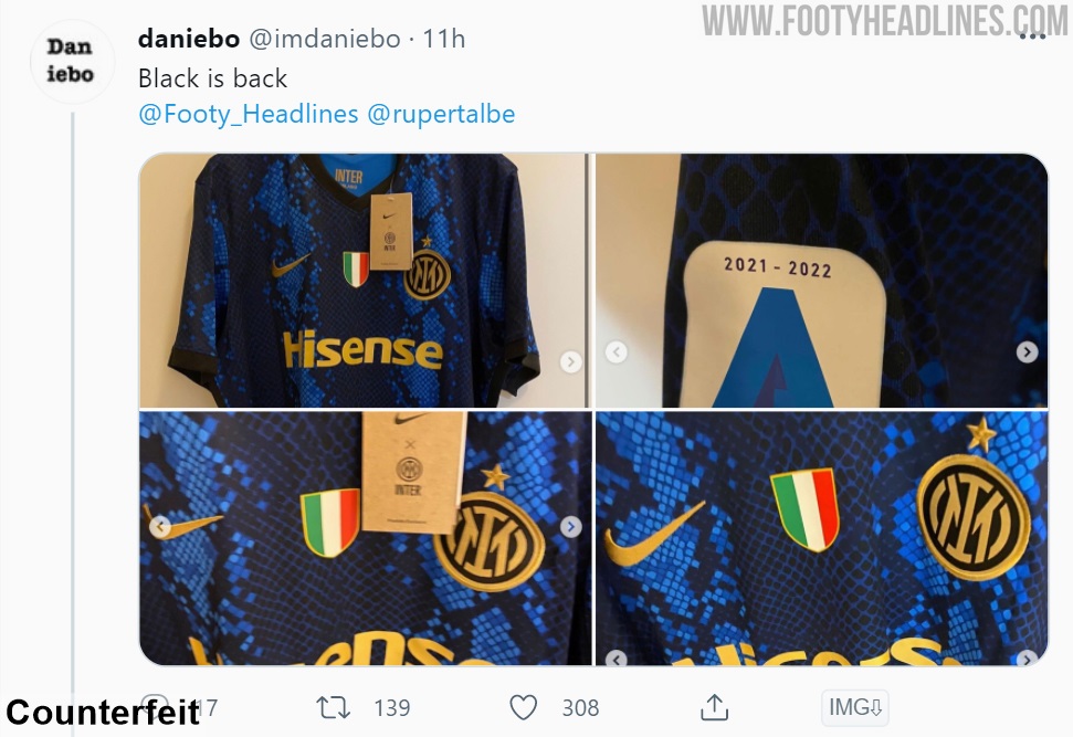 Erstens sieht das grafische Muster schlecht aus und das Inter Wappen ist schief. Zweitens zeigt das Trikot das Logo von Hisense auf der Vorderseite, genau wie ein Mock-up von @rupertalbe. Das tatsächliche Trikot könnte das Hisense-Logo auf der Vorderseite haben, aber das ist sehr unwahrscheinlich.