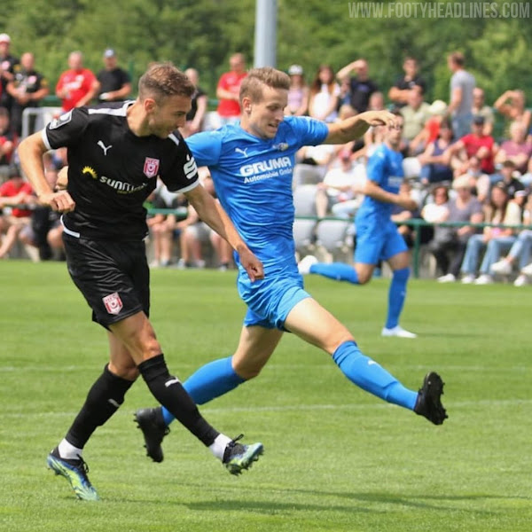 Puma kombiniert das Hallescher FC 2021-22 Auswärtstrikot mit schwarzen Hosen und Stutzen.