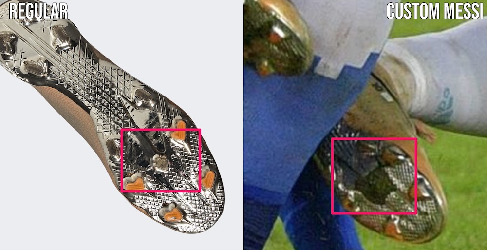 Seltsam ist, dass Messis linker Schuh ohne den mittleren Fußballschuhe im vorderen Bereich zu kommen scheint. Es ist jedoch nur Gras darauf geklebt.