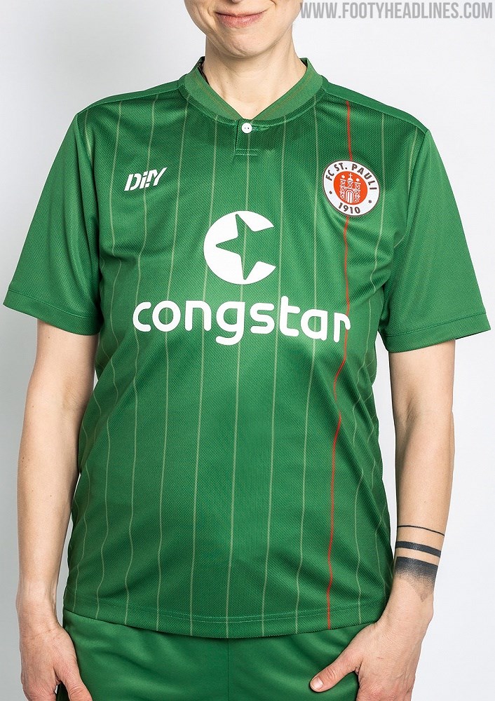 Das In-House FC St. Pauli 2021-22 Tor wart-Trikot hat das gleiche Design und die gleiche Template wie das Trikot der Spieler. Es ist grün mit weißen und einem roten Nadelstreifen.