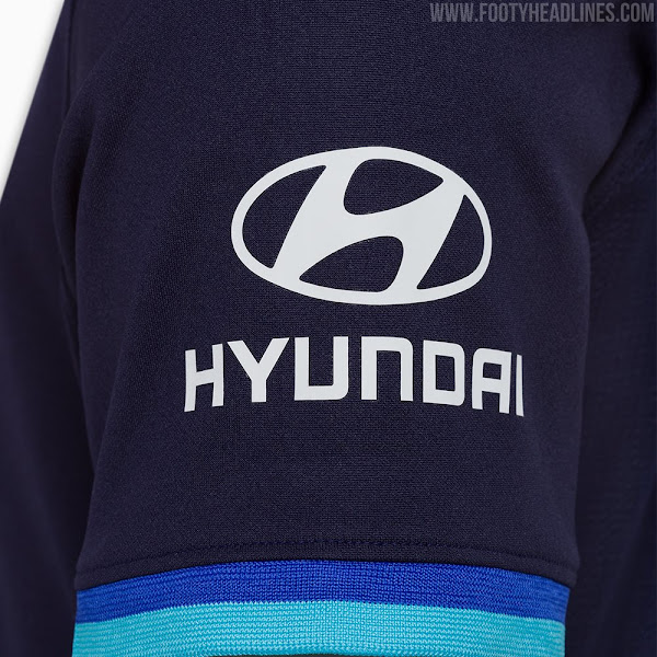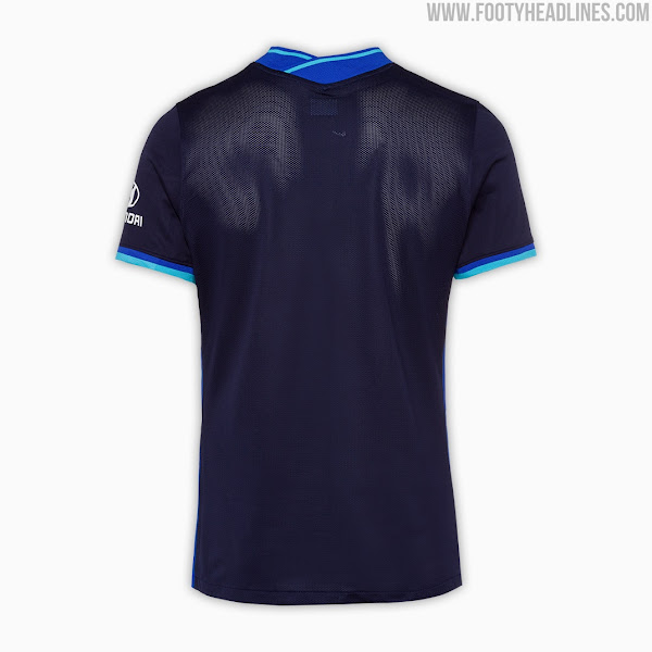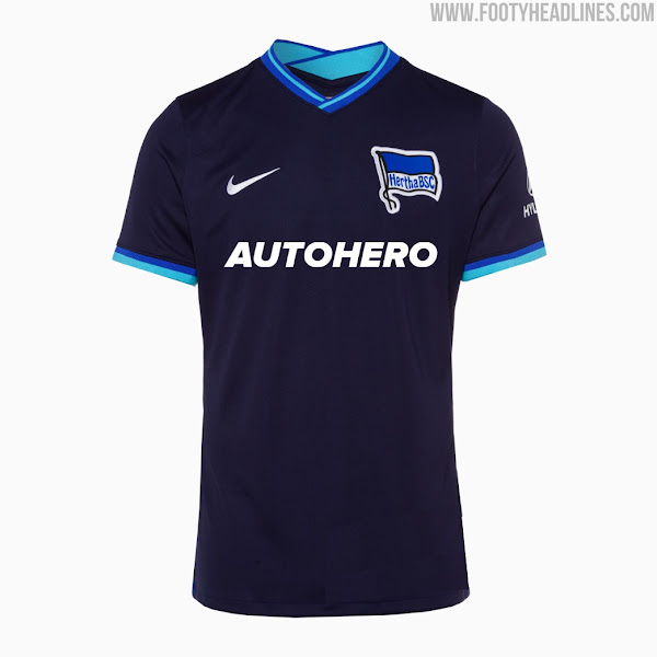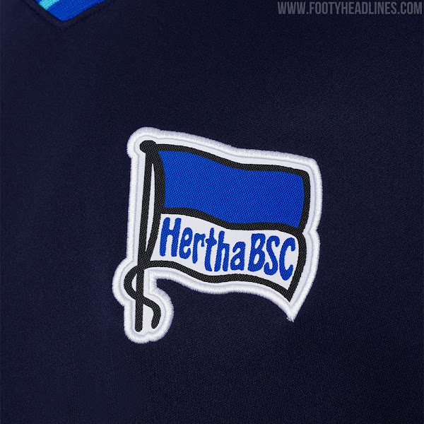 Das Nike Hertha BSC 2021-22 Auswärtstrikot ist einfarbig dunkelblau mit türkisfarbenen Besätzen am Kragen und an den Ärmelbündchen.