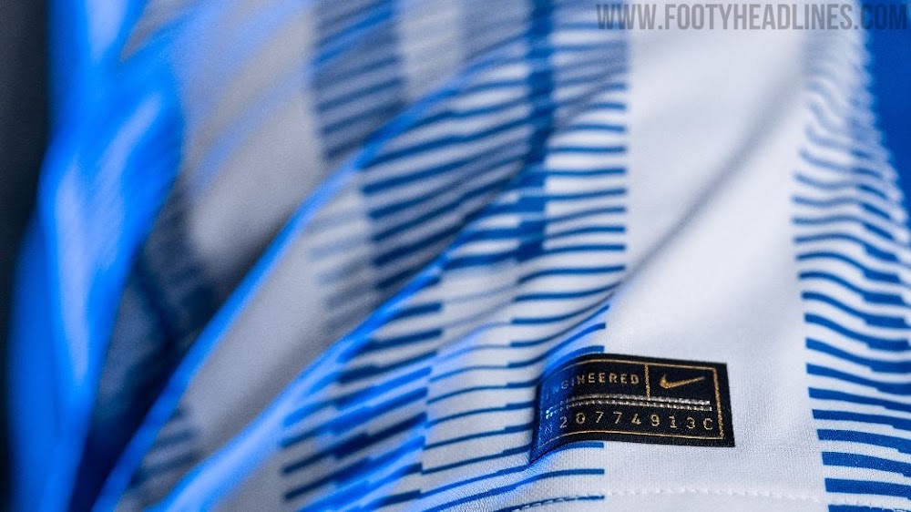 Das Nike Hertha Berlin 21-22 Trikot ist hauptsächlich weiß mit einem abstrakten blauen Streifenmuster, während es das Logo des neuen Hauptsponsors Autohero zum ersten Mal überhaupt.