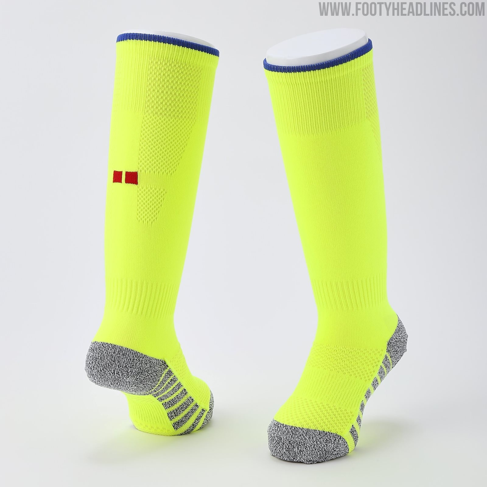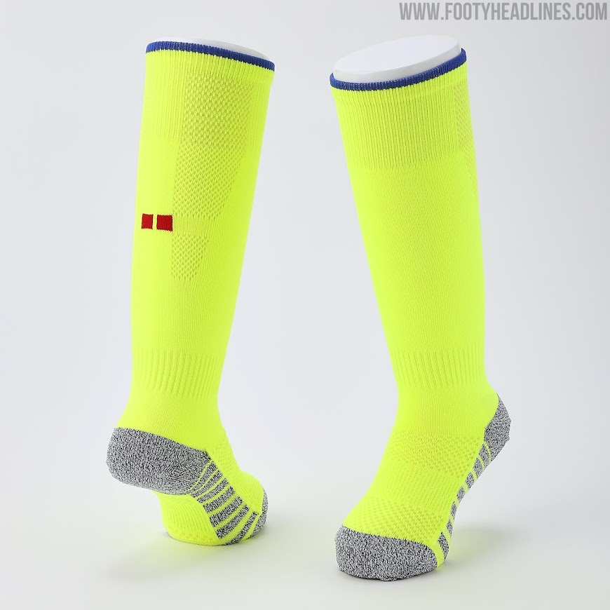 Seltsam ist, dass die marineblauen Hosen traditionelle gelbe Nummern haben. Die Stutzen sind fluo-gelb.