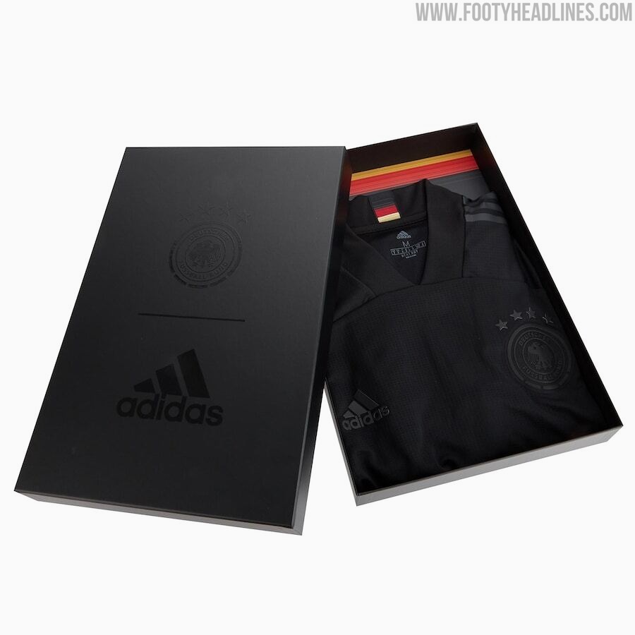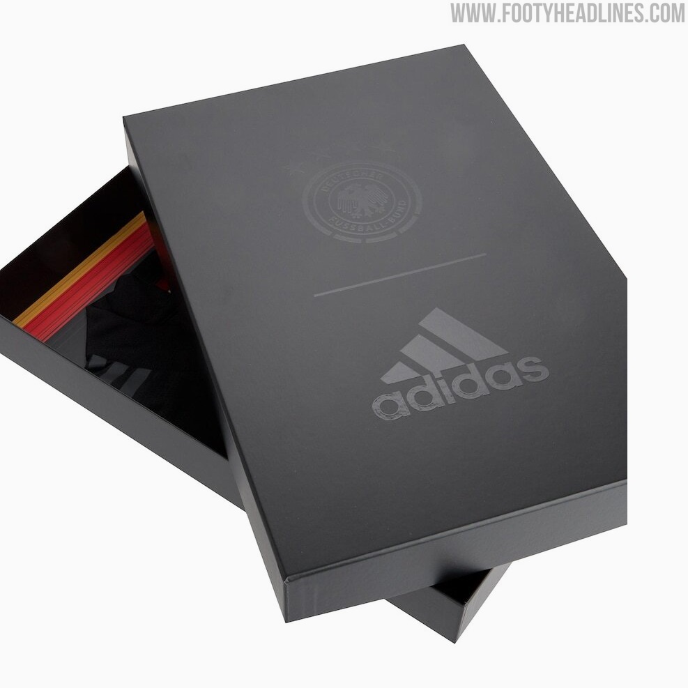 Das Trikot wird in einer anthrazitfarbenen Box geliefert, auf der sich die geschwärzten DFB- und Adidas-Logos befinden.