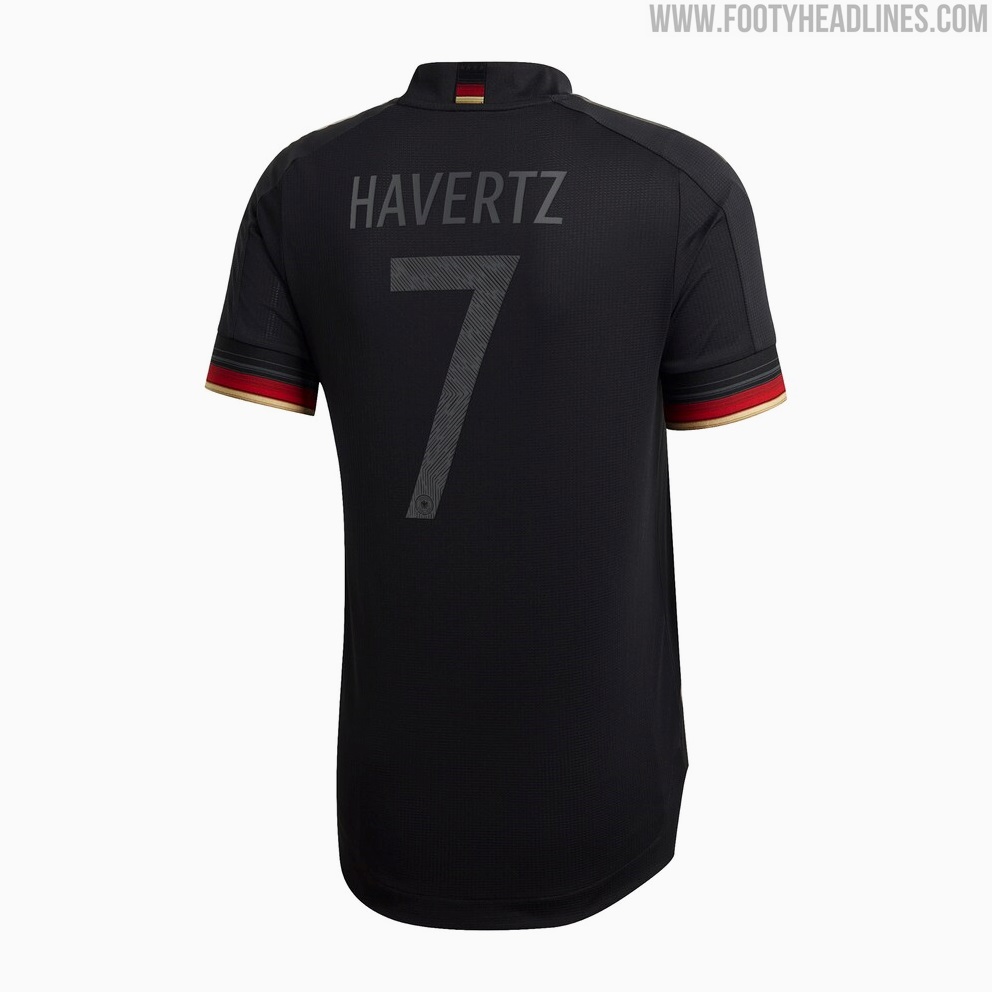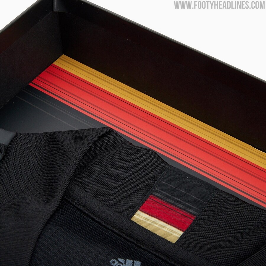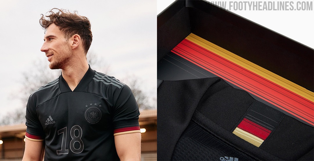 Das Adidas Deutschland Limited Edition Auswärtstrikot ist die authentische Version. Es ist komplett schwarz mit Ausnahme der Manschetten, die die Deutschland-Flagge in den Farben Schwarz, Rot und Gelb haben. Die Flagge wird auch auf dem Rücken präsentiert.