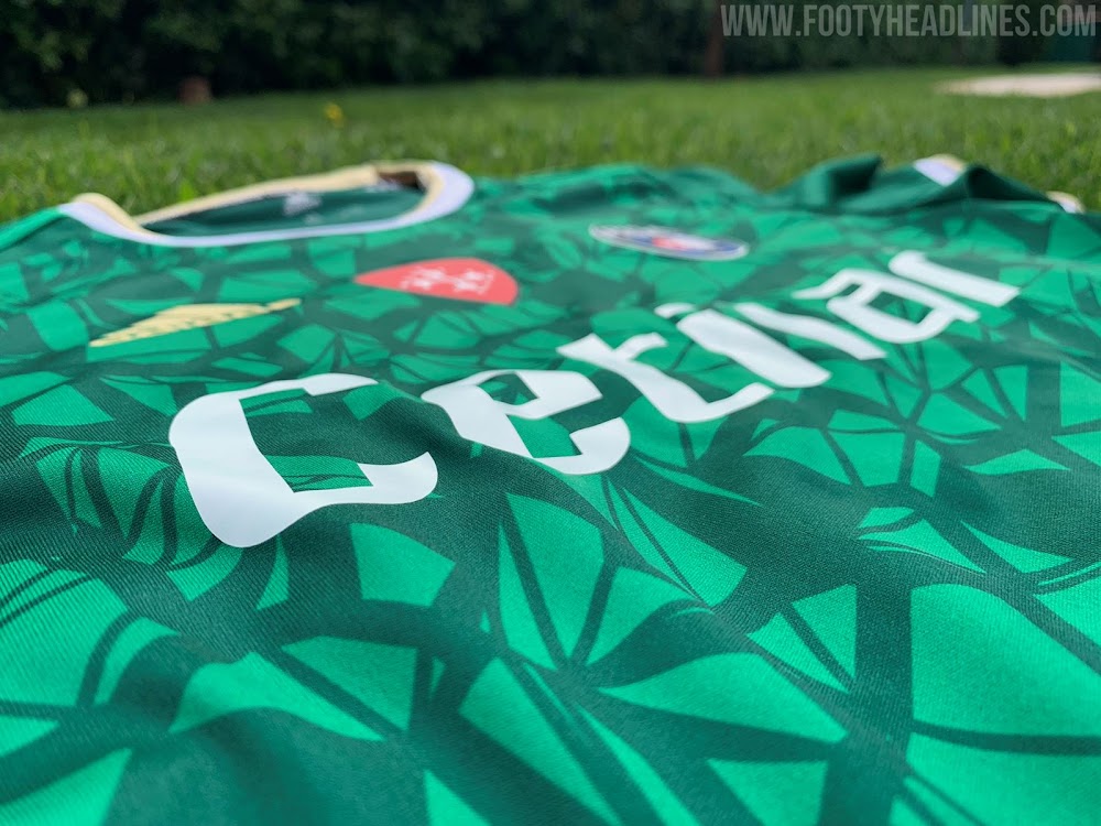 Das Adidas Pisa 2021-22 dritte Trikot ist in Smaragdgrün mit einer geometrischen Allover-Grafik, die in einem helleren Grünton gehalten ist.