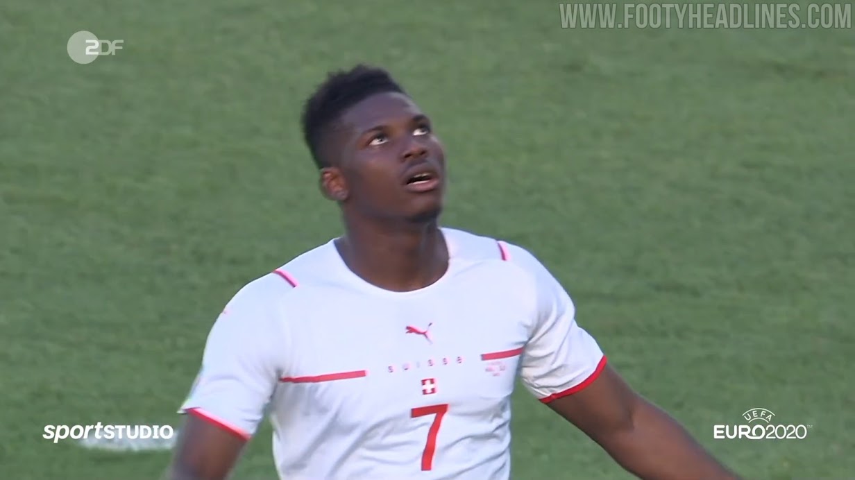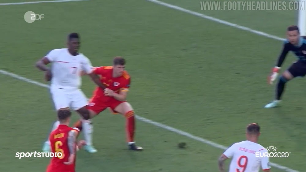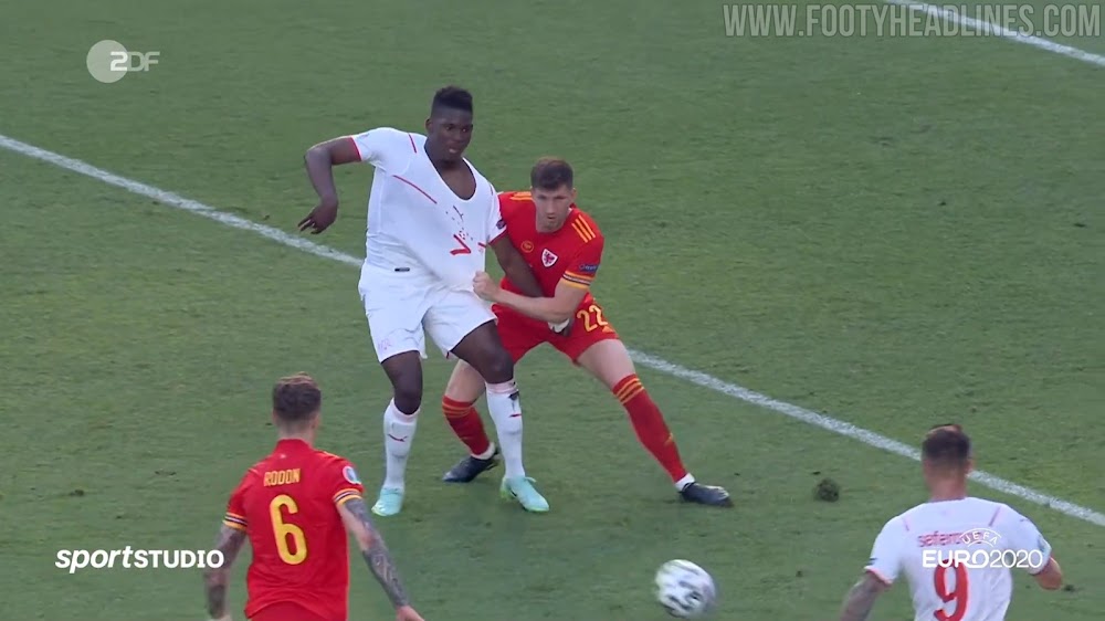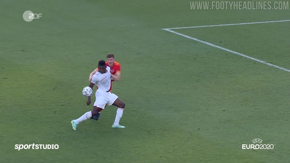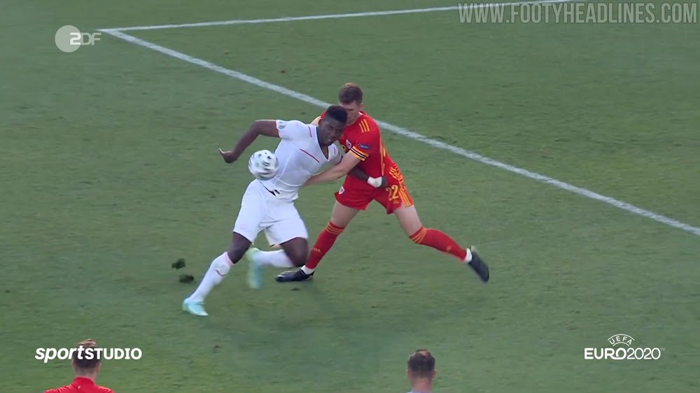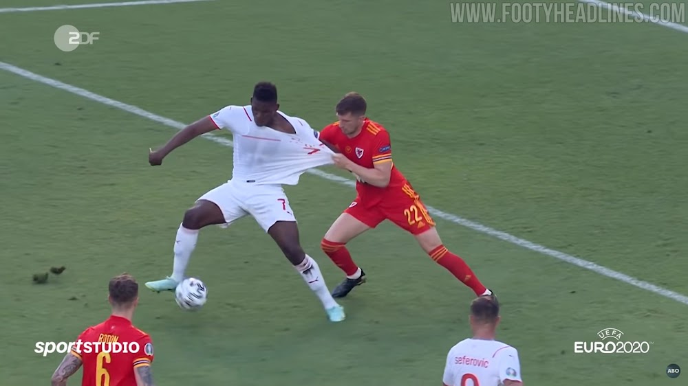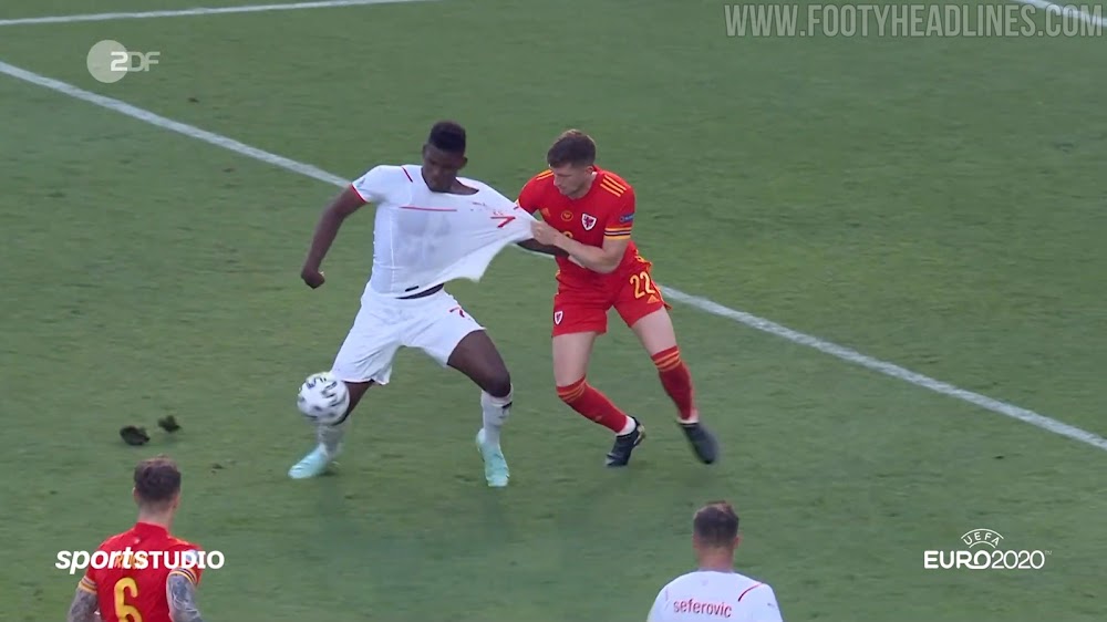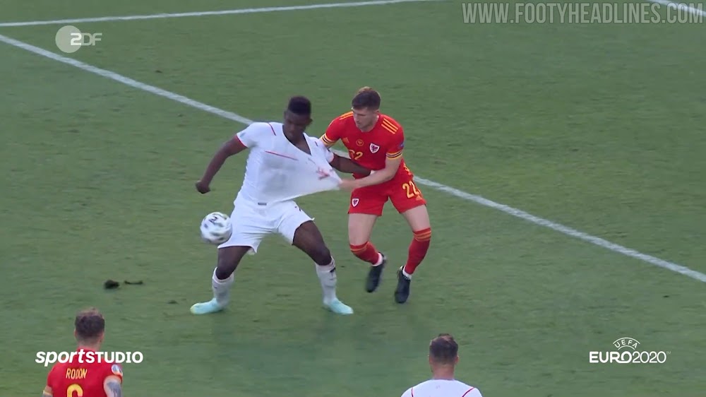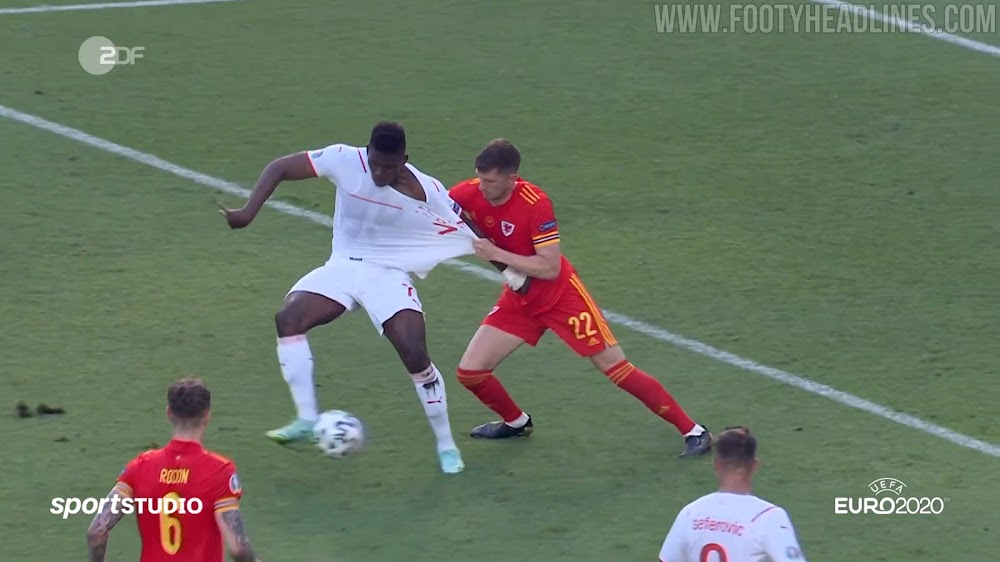 Tatsächlich hält sich Embolo auch am Trikot des Gegners fest, aber das Adidas Wales Euro 2020 Trikot ist überhaupt nicht dehnbar - das liegt auch daran, dass Wales die Adidas Replica Trikot Technologie, AEROREADY, verwendet.