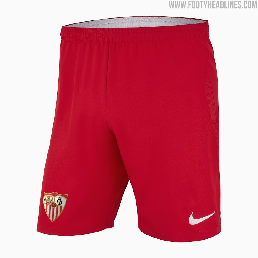 Nike kombiniert das Sevilla FC 2021-2022 Auswärtstrikot mit roten Hosen und Stutzen.