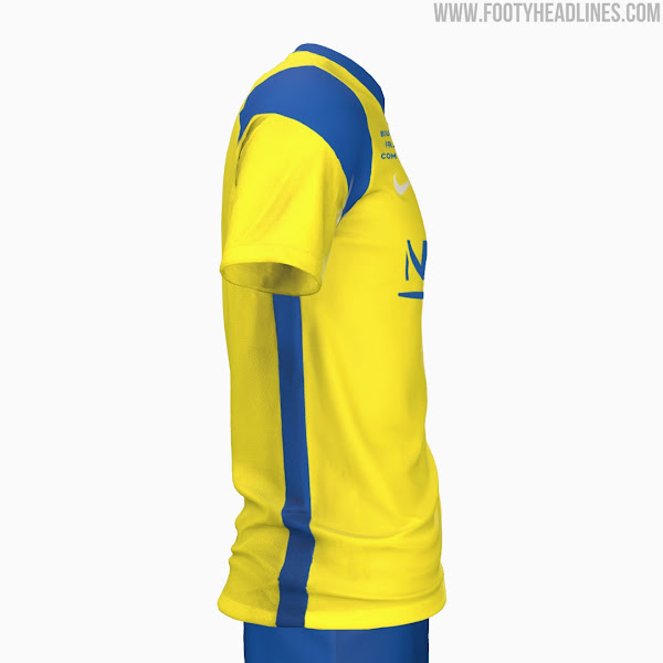 Das Nike Sochaux 21-22 Trikot ist gelb mit blauen Details an den Schultern und am Kragen.