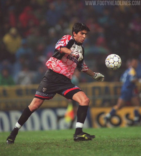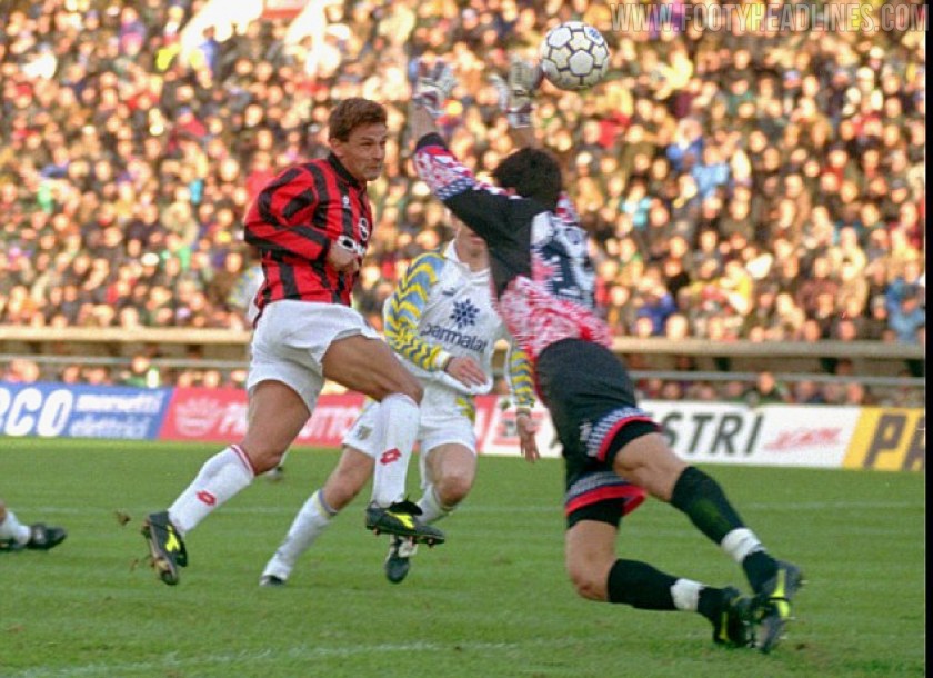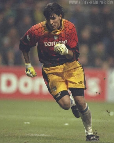 Eines seiner frühesten Bilder bei Parma, hier ist das 1993er Torwarttrikot, das von Umbro hergestellt wurde. Ein kräftiger pinker Hintergrund mit grafischem und subtilem Rauten-Alloverdruck.