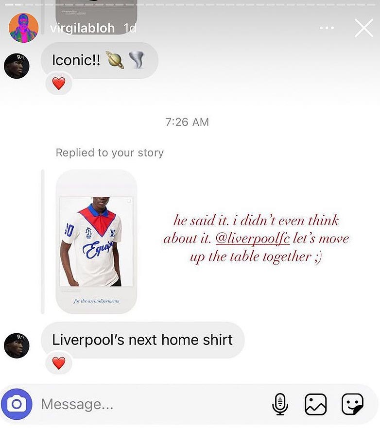 Die Geschichte entstand, als ein Follower von Abloh ein Bild eines neuen Polos aus der Louis Vuitton Winter 21-22 Kollektion teilte und dem Designer eine Nachricht schickte, in der er vorschlug, dass das Design für das nächste Liverpool Trikot verwendet werden sollte.