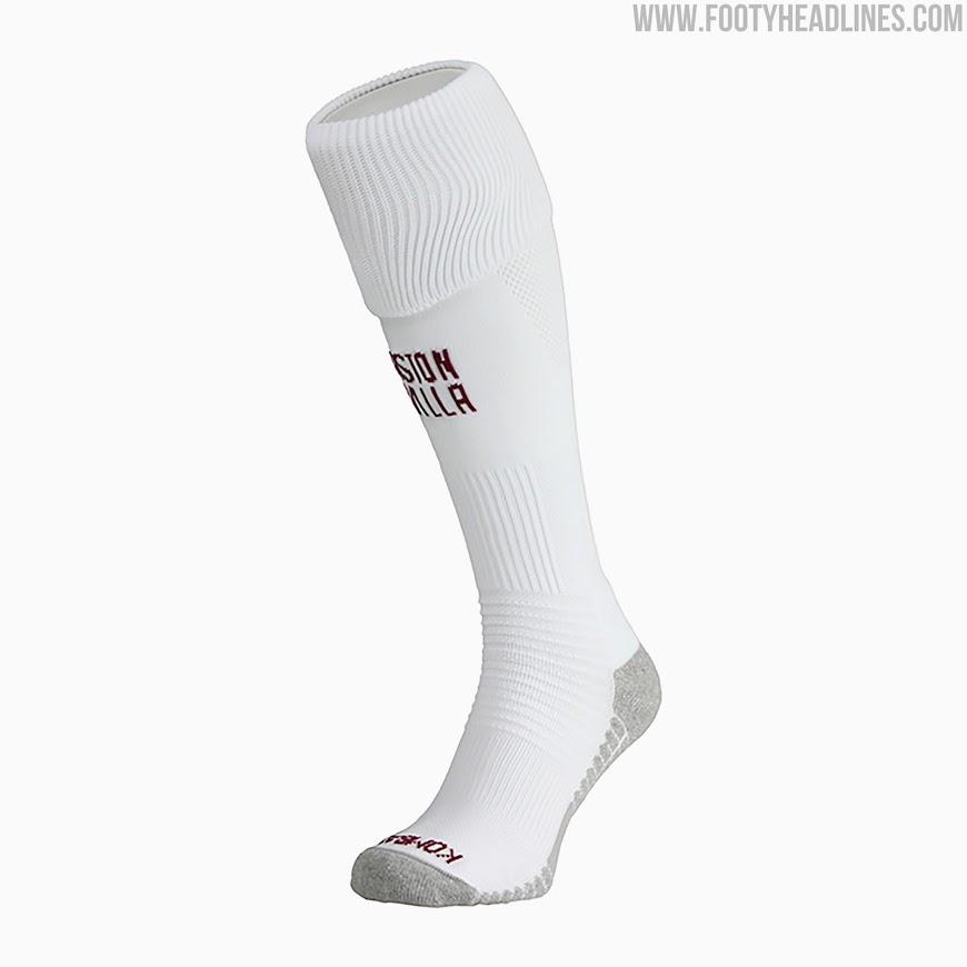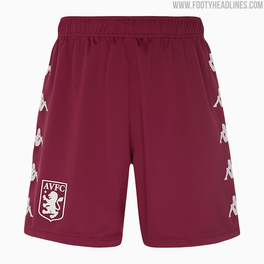 Claret/weiß/blaue Hosen und weiße Stutzen runden den Look des neuen Aston Villa 2021-2022 Auswärtstrikots von Kappa ab.
