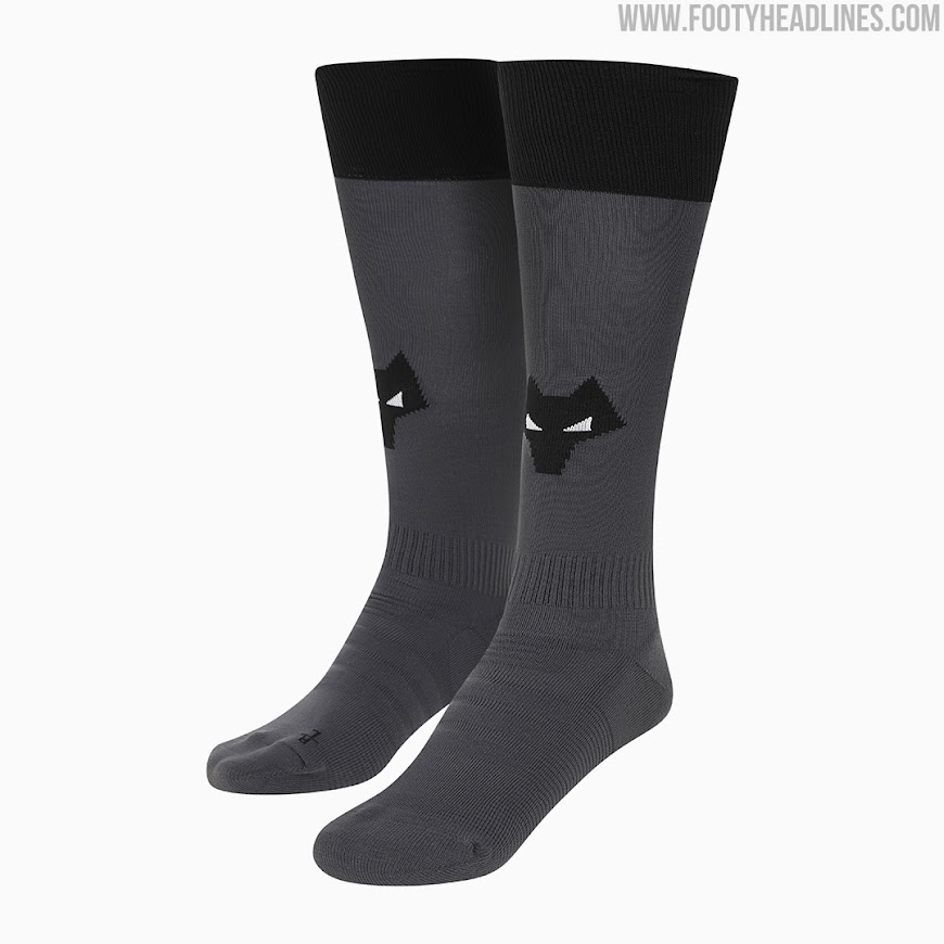Graue Hosen und Stutzen runden den Look des neuen Wolves 2021-2022 Auswärtstrikots von Castore ab.