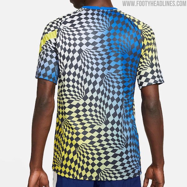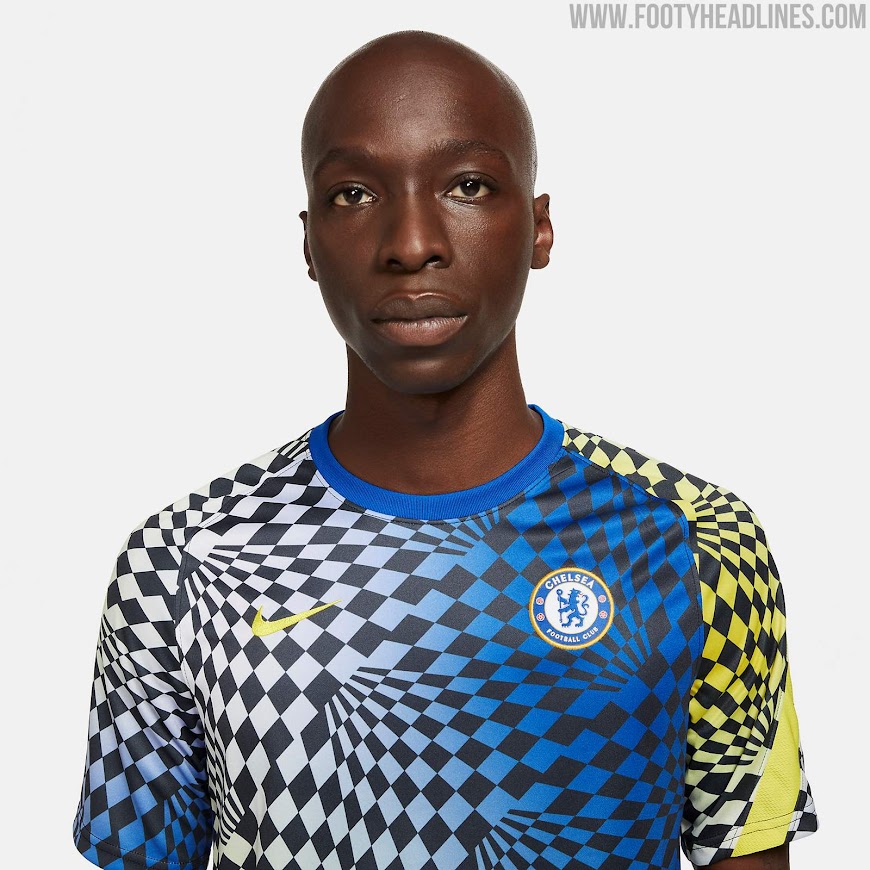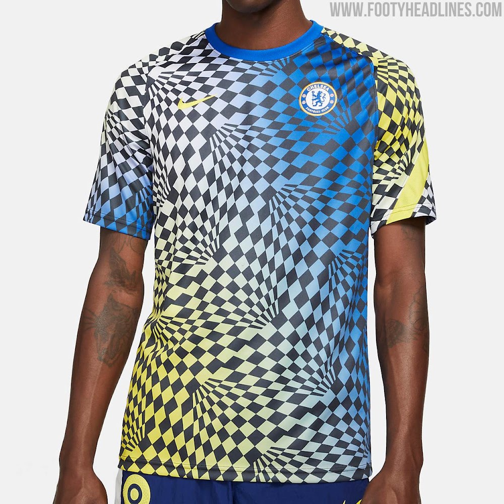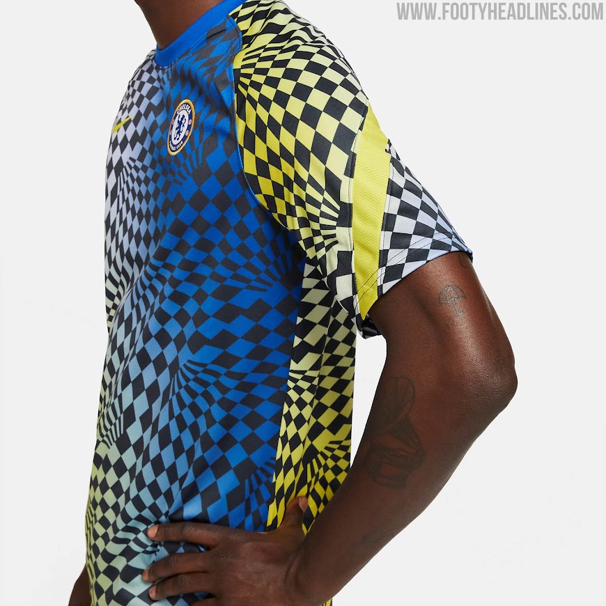 Das Nike Chelsea 2021-2022 Pre-Match Trikot ist ähnlich inspiriert wie das Trikot und kombiniert ein abstraktes Karomuster mit einem Farbverlauf von Blau zu Gelb.