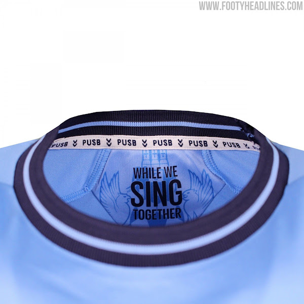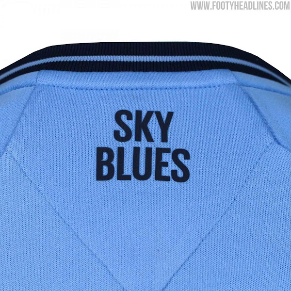 Der Schriftzug "Sky Blues" befindet sich auf der Rückseite des Trikots, während die Worte "While We Sing Together" auf der Innenseite des Trikots zu lesen sind.