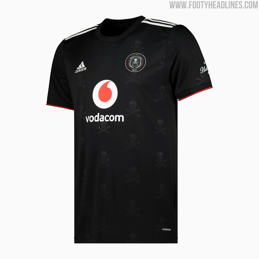 Dieses Bild zeigt das Design des neuen Adidas Orlando Pirates F.C. Heimtrikots für 21-22.