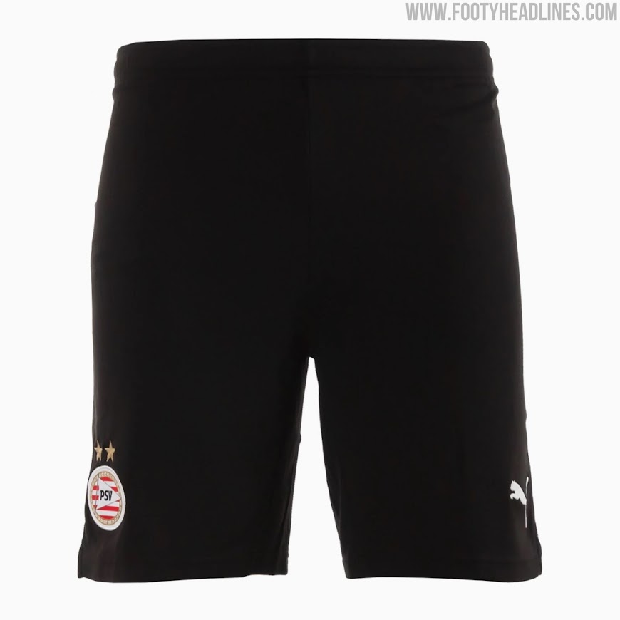 Puma kombiniert das PSV Eindhoven 2021-22 Trikot mit schwarzen Hosen und weißen Stutzen.