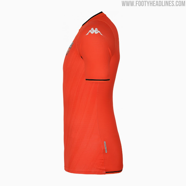 Das Lorient 2021-2022 Trikot ist orange mit einer schwachen Grafik auf der Vorderseite sowie schwarzen Besätzen am Kragen und an den Ärmeln. Die Logos sind weiß.