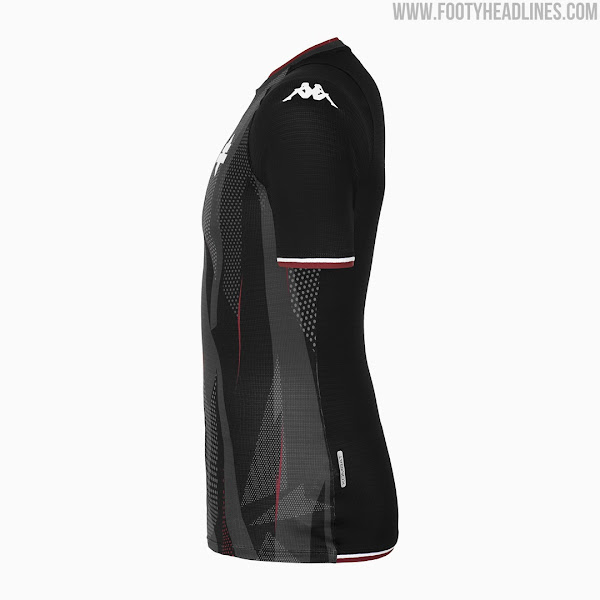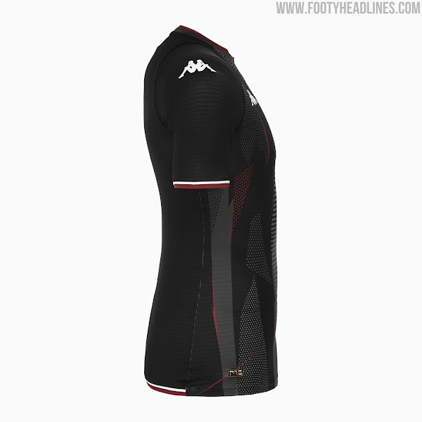 Das Kappa FC Metz 21-22 Auswärtstrikot ist schwarz mit weißen Logos und einer ähnlichen Grafik auf der Vorderseite, die neben Weiß auch Bordeauxrot beinhaltet.