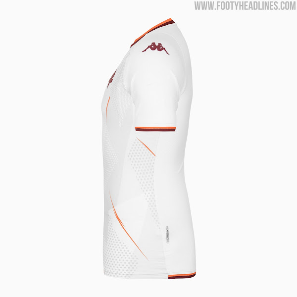 Das dritte Trikot des Kappa FC Metz 2021-2022 ist weiß und zeigt wieder eine ähnliche Grafik - hier ist es grau mit orange. Die Logos sind weinrot, während der Kragen und die Ärmelbündchen zwischen weinrot und orange aufgeteilt sind.