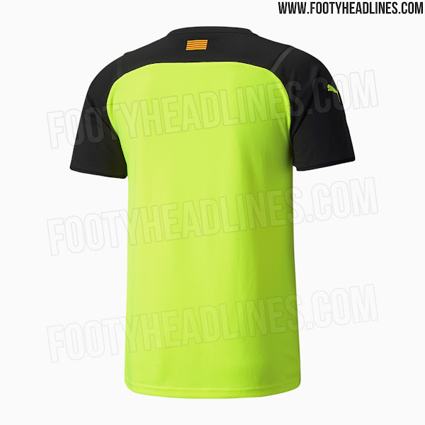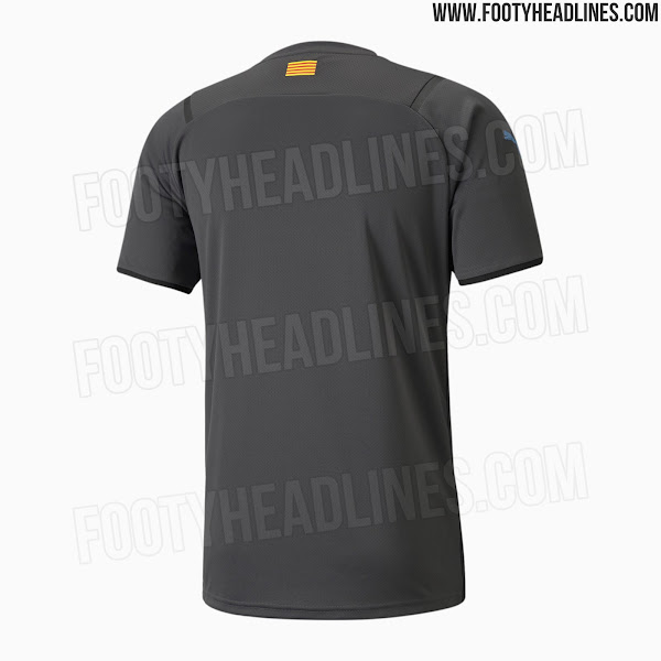 Das Puma Logo ist ebenfalls blau, mit einer weißen Umrandung, während die katalanische Flagge auf dem oberen Rücken unterhalb des Kragens zu sehen ist.