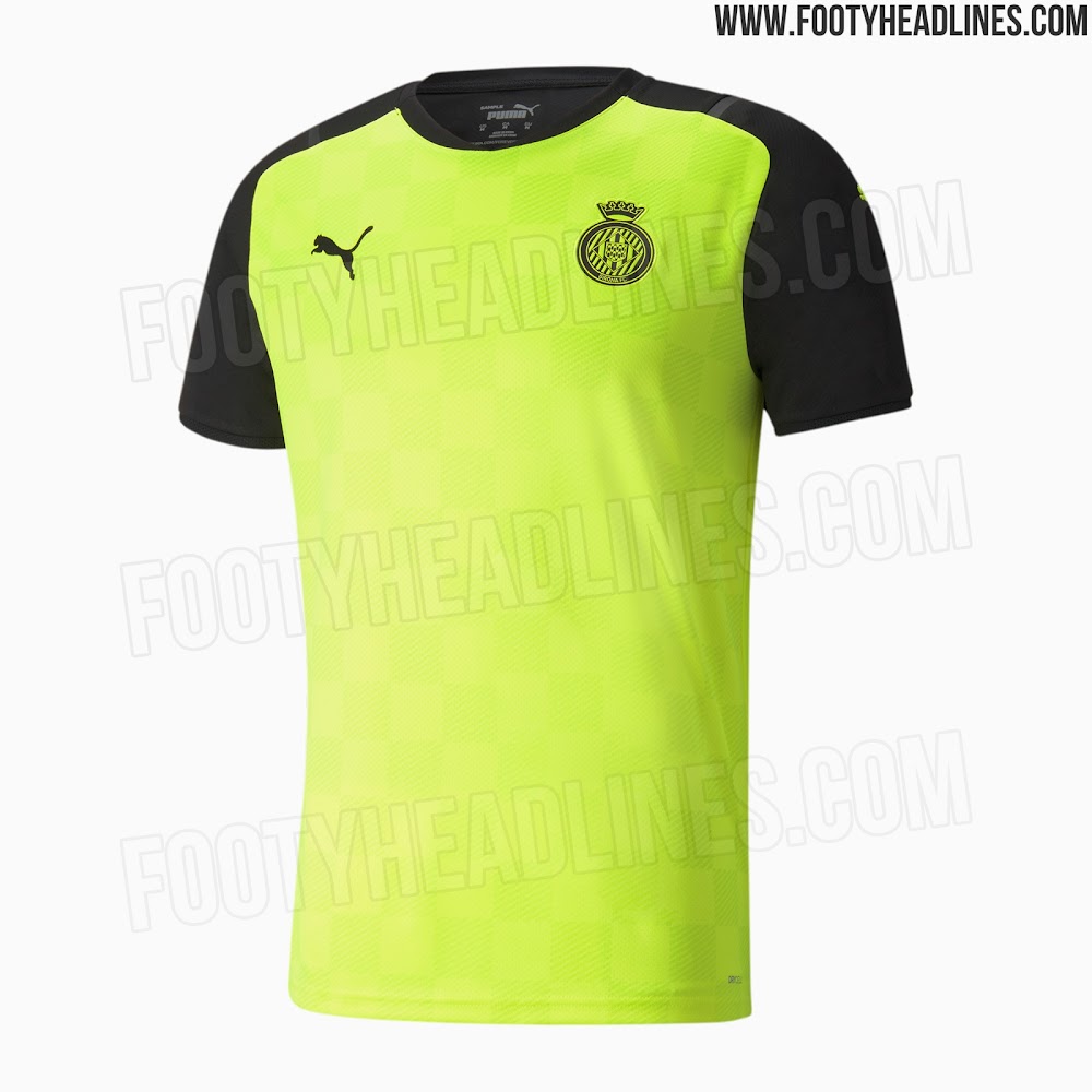 Das Puma Girona 21-22 Auswärtstrikot ist fluo gelb mit einem sehr schwachen Karomuster und schwarzen Ärmeln.