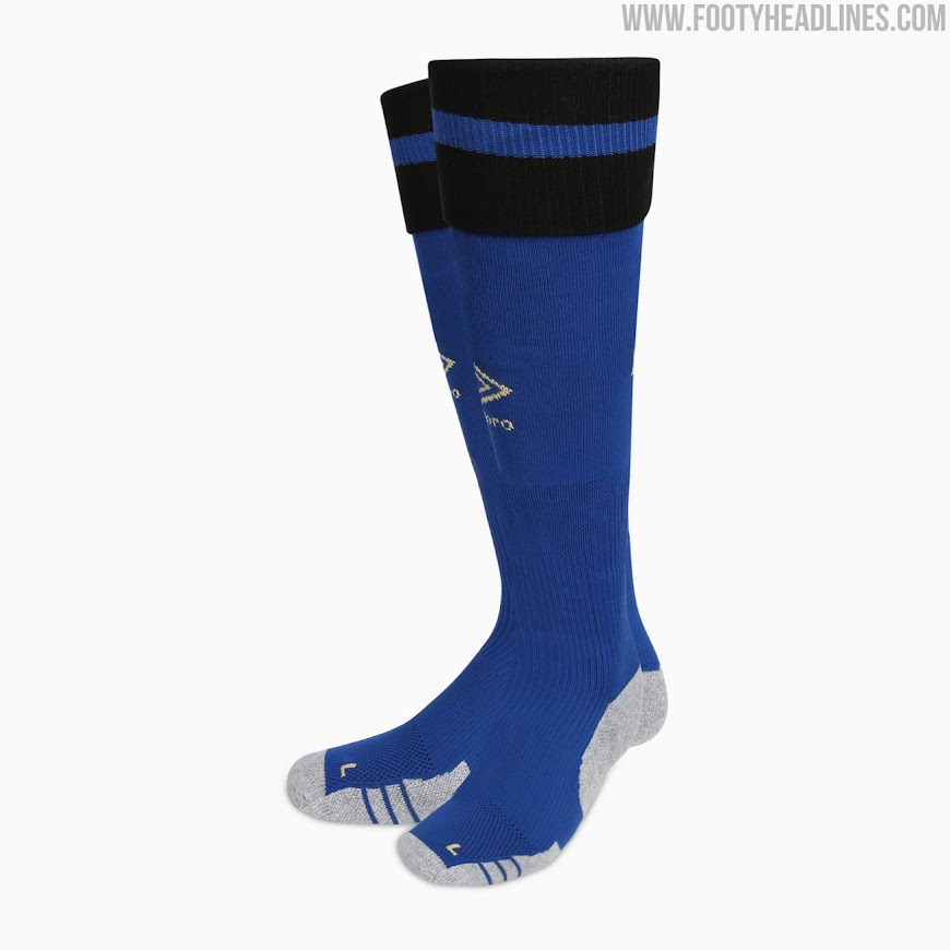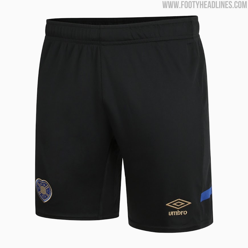 Schwarze Hosen und blaue Stutzen runden den Look des neuen Heart of Midlothian 2021-2022 Ausweich-Trikots von Umbro ab.