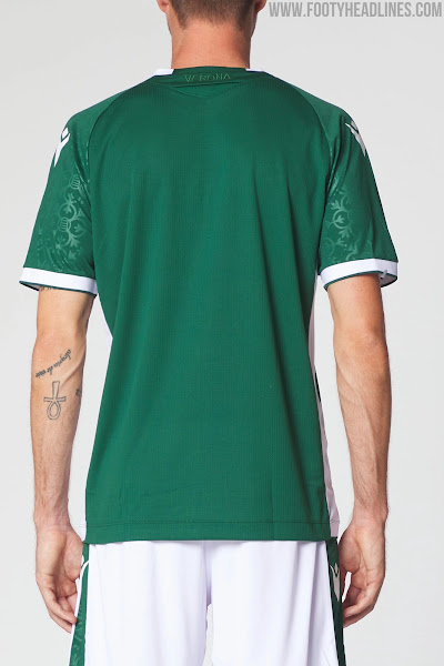 Das Macron Hellas Verona 2021-22 drittes Trikot ist dunkelgrün mit einem weißen Mannschaftskragen und weißen Ärmelbündchen. Ränder, wie auch die weißen Ärmelränder.