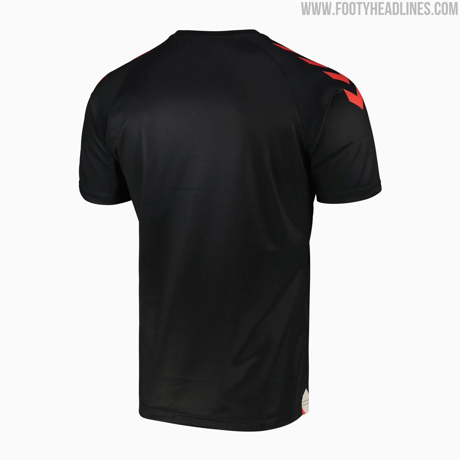 Das Hummel Everton 21-22 Pre-Match Auswärtstrikot hat einen auffälligen Look in Schwarz mit einem Flaggen-inspirierten Design in Weiß, Orange und Anthrazit.