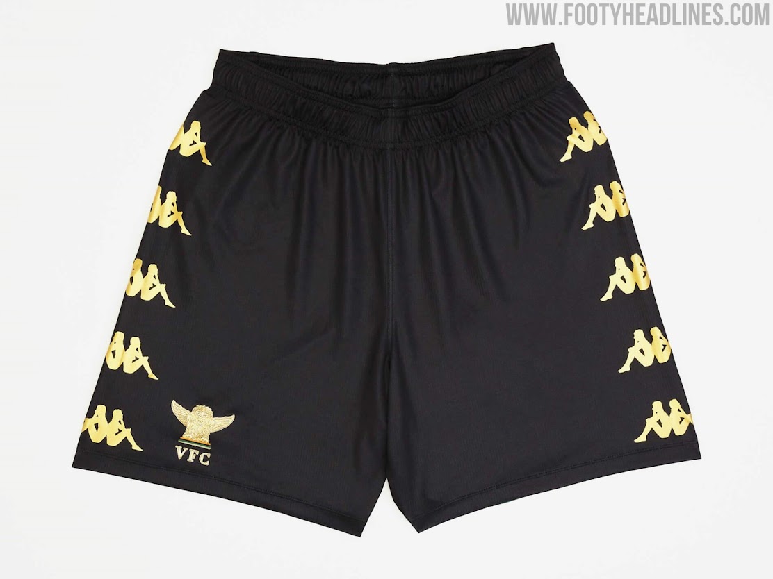 Kappa kombiniert das Venezia FC 21-22 Fußballtrikot mit schwarz/goldenen Hosen und schwarz/grün/orangen Stutzen.