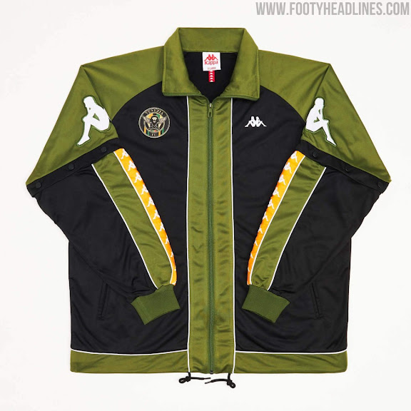 Kappa's Venezia FC Banda Pack beinhaltet drei Artikel - eine klassische schwarz/weiße "Banda Merez" Jacke, eine schwarz/grüne "Hunt Jacket" und ein bräunliches "Banda Arset T-Shirt".