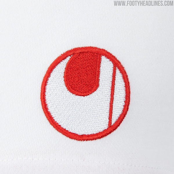 Das Uhlsport Köln 2021-2022 Heim Fußballtrikot ist hauptsächlich weiß mit dünnen horizontalen Streifen auf der Vorderseite in rot, passend zur Farbe der Logos sowie der Ärmelbündchen-Paspelierung.