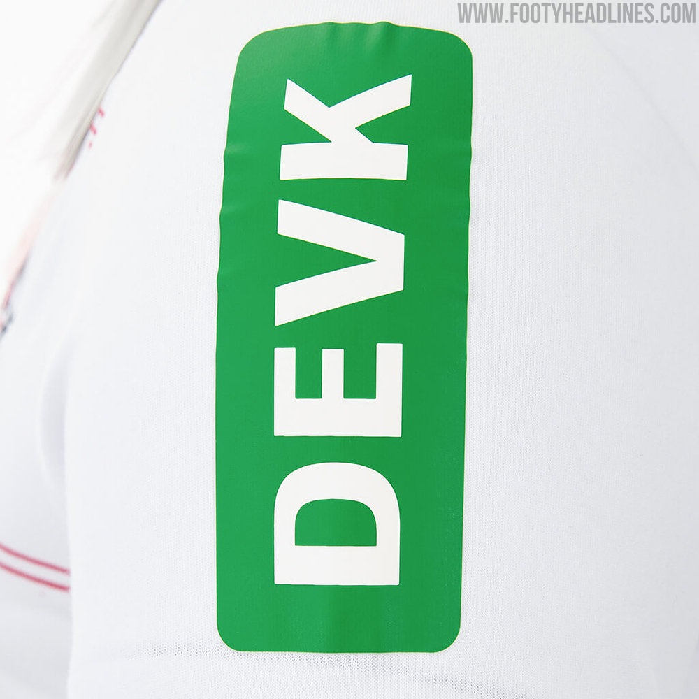Das Uhlsport Köln 2021-2022 Heim Fußballtrikot ist hauptsächlich weiß mit dünnen horizontalen Streifen auf der Vorderseite in rot, passend zur Farbe der Logos sowie der Ärmelbündchen-Paspelierung.