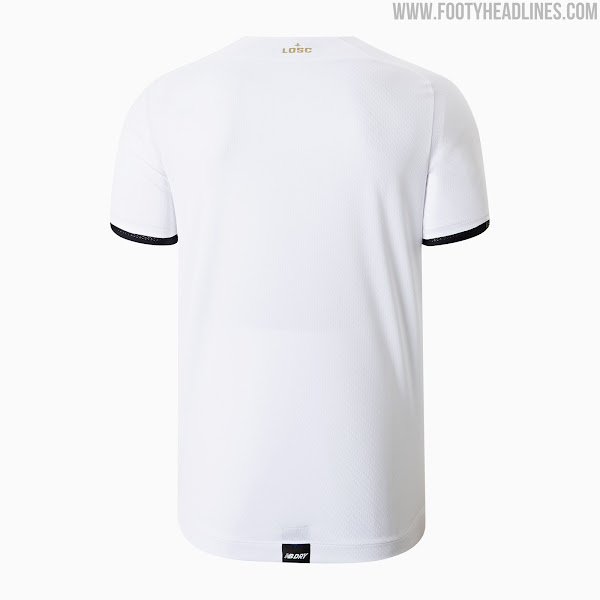 Das New Balance Lille LOSC 21-22 Ausw ärtstrikot ist klassisch und kombiniert eine weiße Basis mit schwarzen und metallisch-goldenen Verzierungen und Logos, inspiriert von der "Opulenz der High Fashion Laufstege".