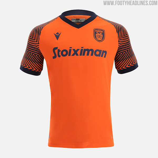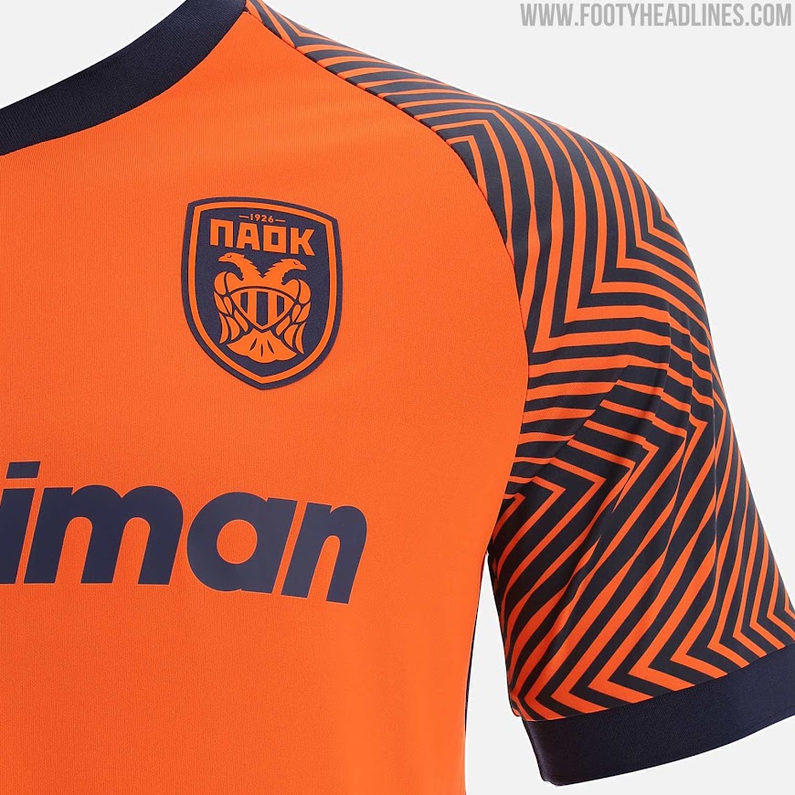 Das vierte Trikot von Macron PAOK 2021-2022 wurde heute ebenfalls vorgestellt. Es präsentiert einen lebendigen Look in Orange und Marineblau, inklusive monochromer Logos und bietet eine gute Alternative im Falle eines Zusammenstoßes.