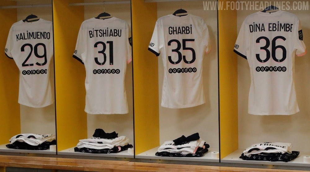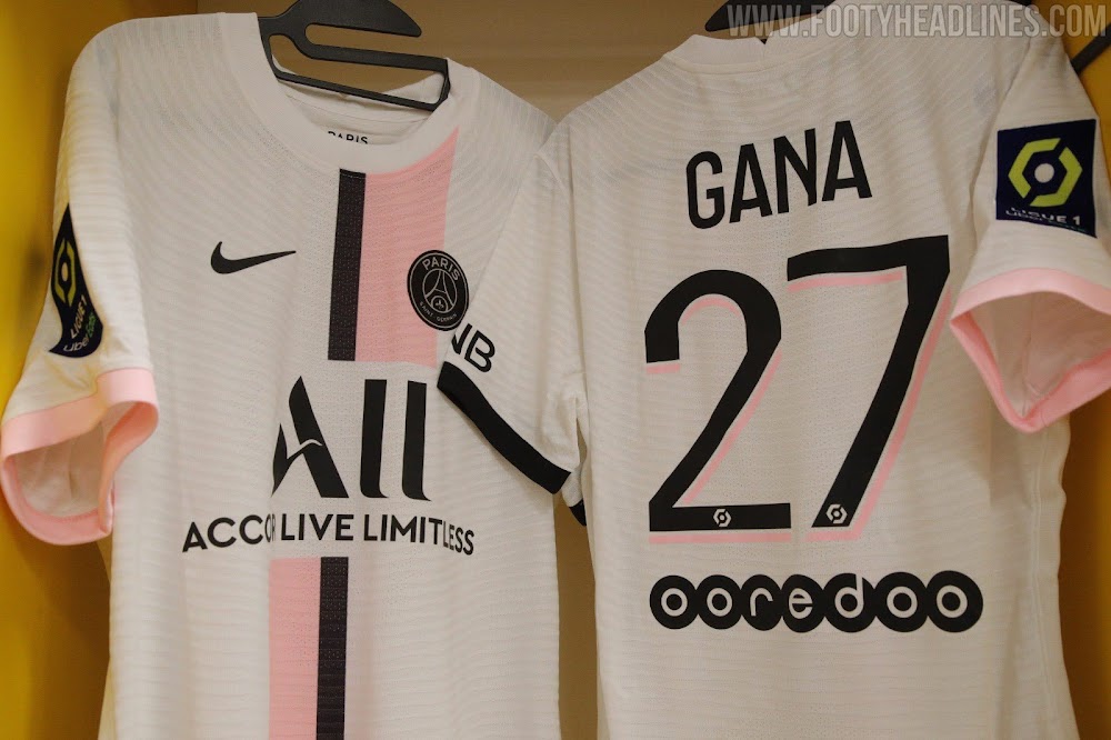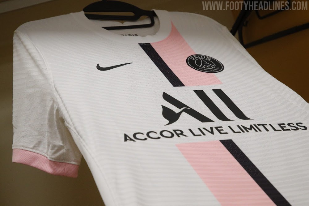 Das PSG-Auswärtstrikot 2021-2022 sieht auf dem Spielfeld ganz anders aus als das Trikot 21-22 von Barcelona. Es ist ein sehr sauberer, kompletter Look in Weiß, Pink und Schwarz.