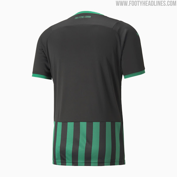 Das Puma Lens 2021-22 Auswärtstrikot ist schwarz mit grünen Streifen, die auf der Vorderseite und dem unteren Rücken erscheinen. Die Logos sind weiß.