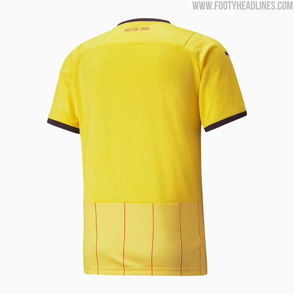 Das Puma RC Lens 21-22 Trikot ist nicht mehr gestreift wie in den letzten Jahren, sondern ist überwiegend gelb mit roten Nadelstreifen sowie einer roten Schärpe von links oben nach rechts unten.