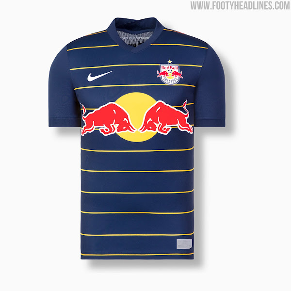 Basierend auf der gleichen Template, ist das Nike Red Bull Salzburg 2021-22 Auswärtstrikot dunkelblau mit gelben Querstreifen und einem weißen Swoosh.