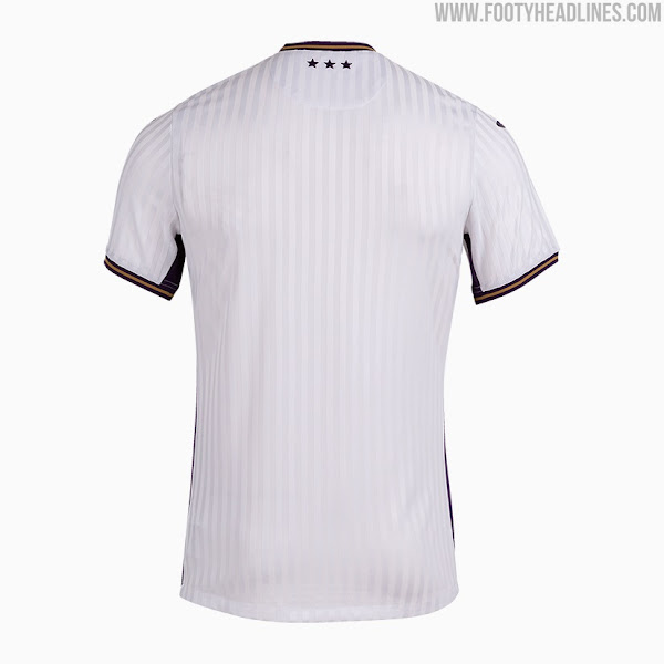 Das Joma RSC Anderlecht 21-22 Auswärtstrikot ist weiß mit tonalen Jacquard-Streifen, während der Kragen und die Manschetten lila mit goldenen Besätzen sind.