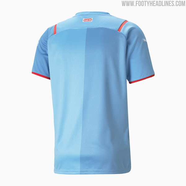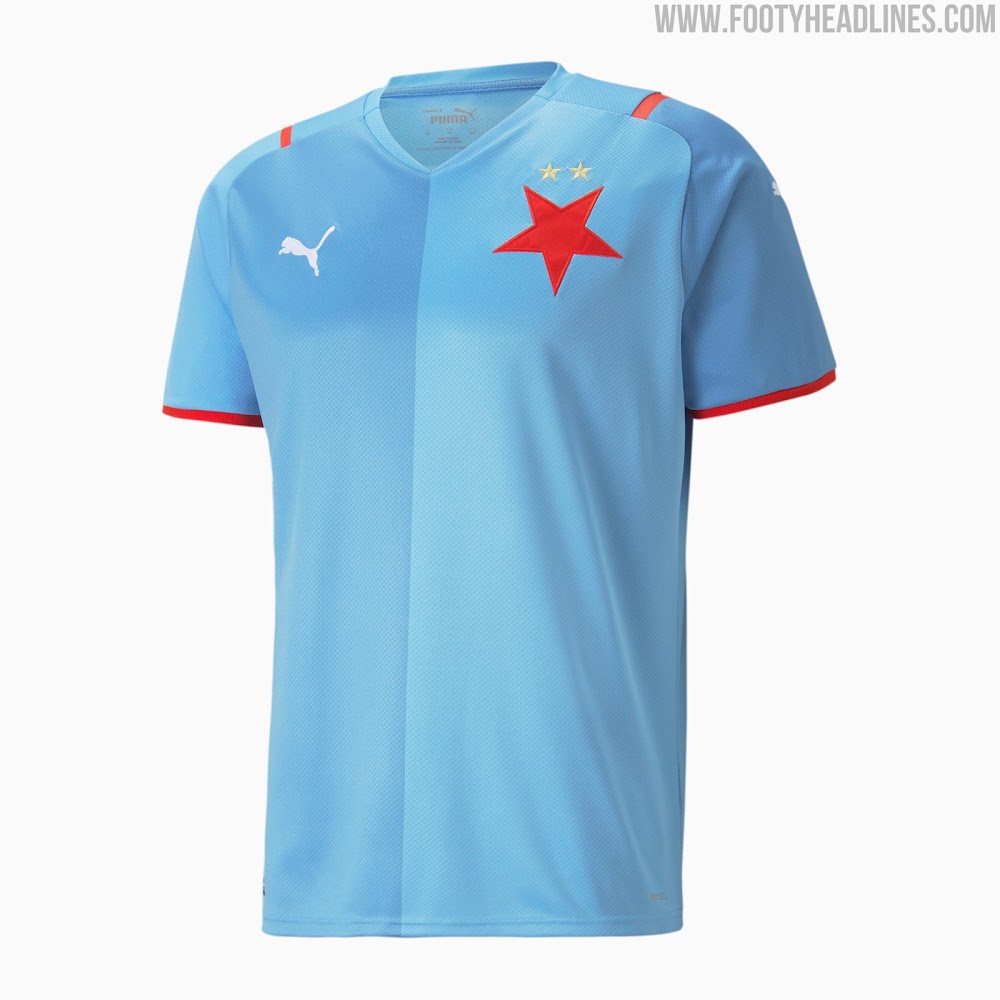 Blau steht im Mittelpunkt des Puma Slavia Praha 21-22 Auswärtstrikots, das ansonsten auf der gleichen Template basiert und ebenfalls einen, wenn auch dezenten, Halb-und-Halb-Stil aufweist.