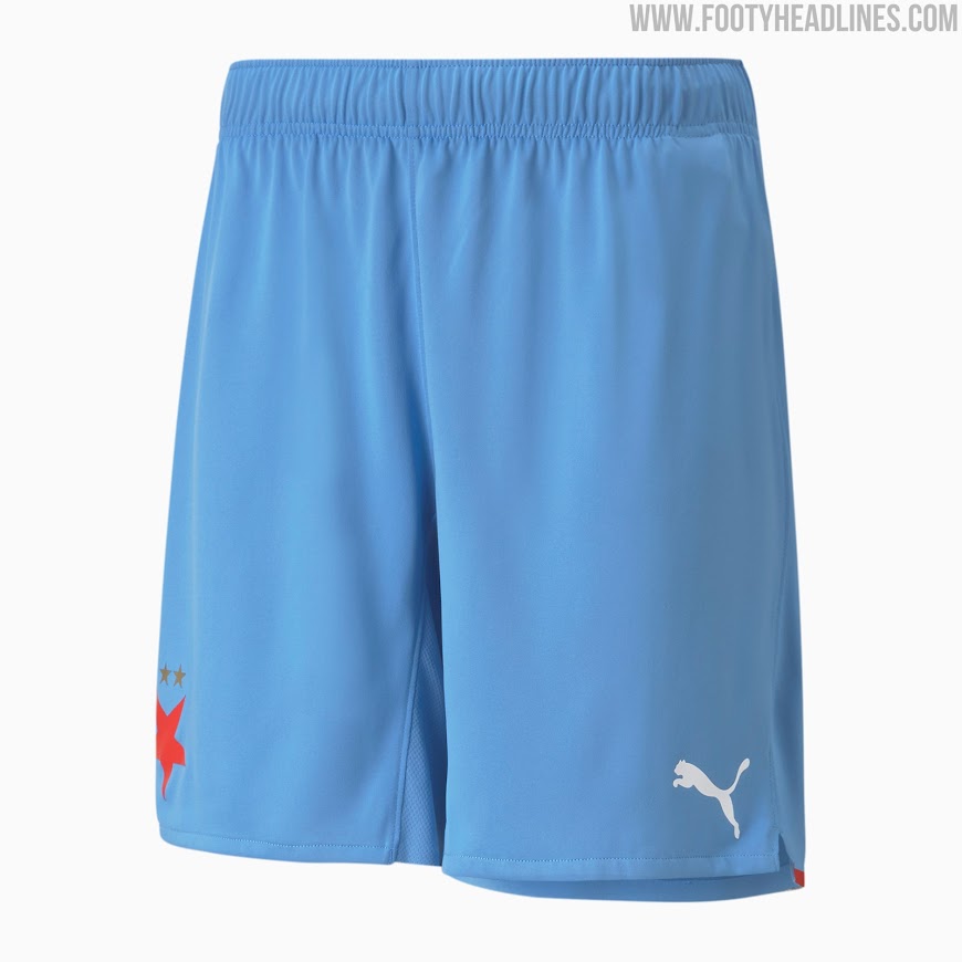 Blaue Hosen und weiße Stutzen vervollständigen das neue Puma Slavia Prag 2021-22 Auswärtstrikot.