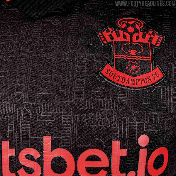 Das Hummel Southampton 2021-22 drittes Trikot hat einen einzigartigen Look auf Schwarz und Rot. Es ist eine Hommage an die aktuelle und frühere Heimat des Vereins mit einer geprägten Grafik mit St Mary's und The Dell auf der Vorderseite des Trikots in Ton-in-Ton-Material.