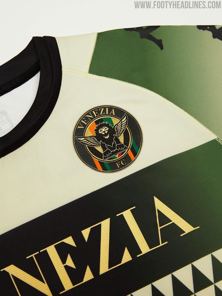 Das Trikot hat ein schwarzes Brustband, auf dem Venezia in goldener Schrift steht. Alle Kappa-Logos sind schwarz, ebenso wie der Kragen und die Ärmelbündchen.