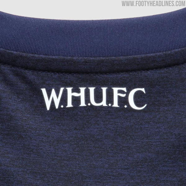 Das Umbro West Ham 2021-2022 drittes Trikot ist marineblau mit einem Melange-Druck und verfügt über weinrote und blaue Besätze am Kragen und an den Ärmelbündchen.