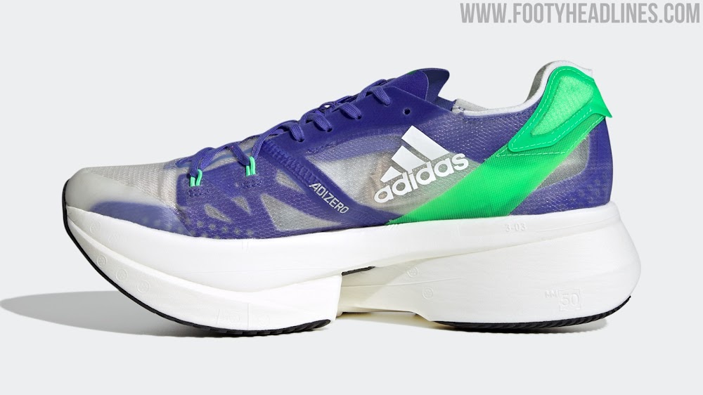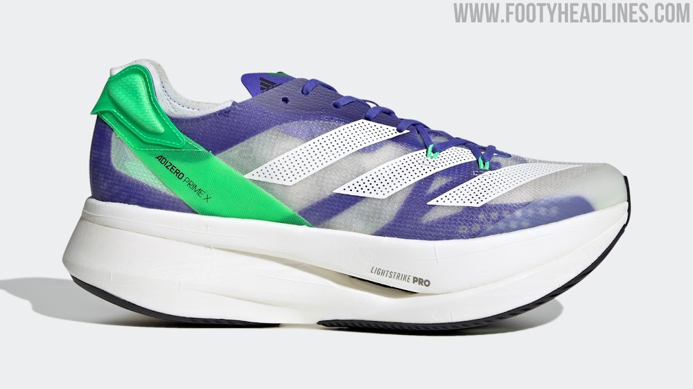 Die neuen Adidas Speedflow+ Adizero X Fußballschuhe kombinieren Weiß mit Dunkelblau und Grün in einem teilweise durchsichtigen Look, der an die Adizero Prime X Laufschuhe von Adidas erinnert.