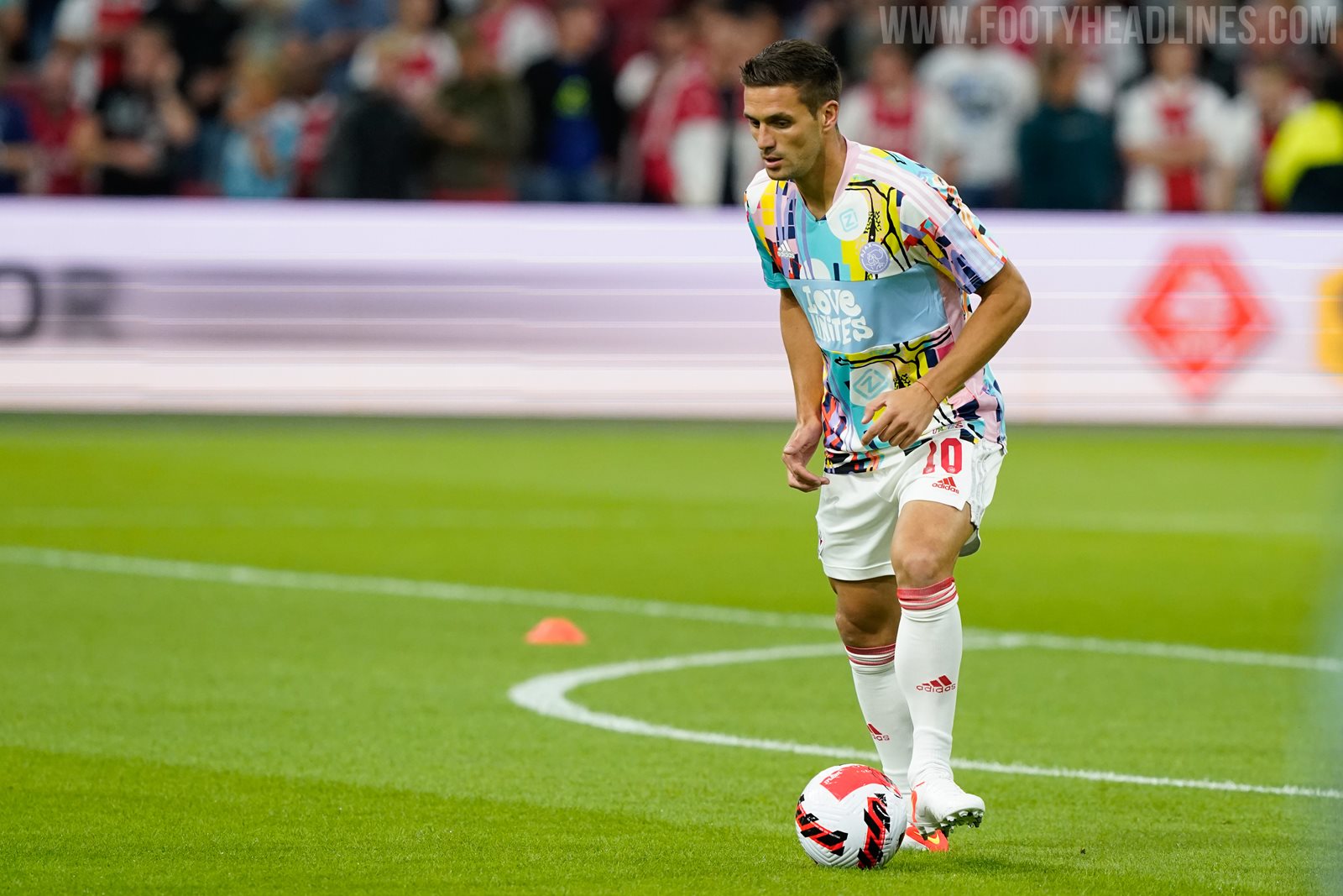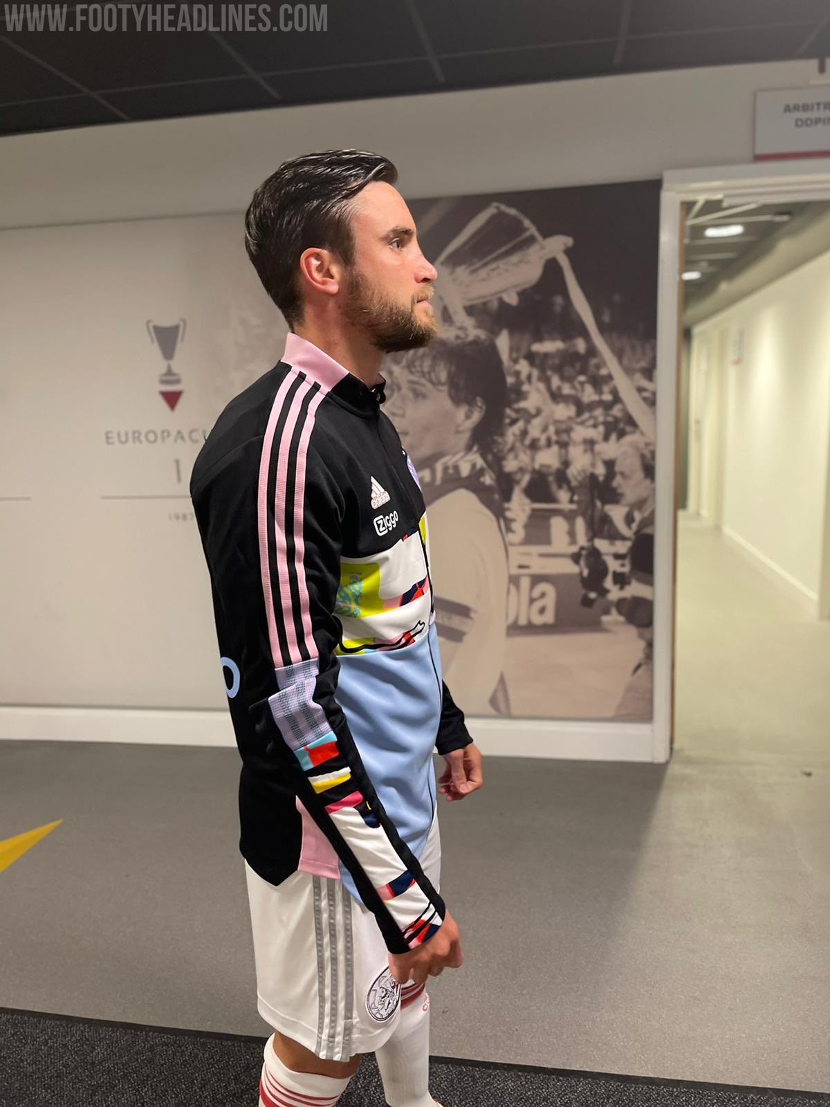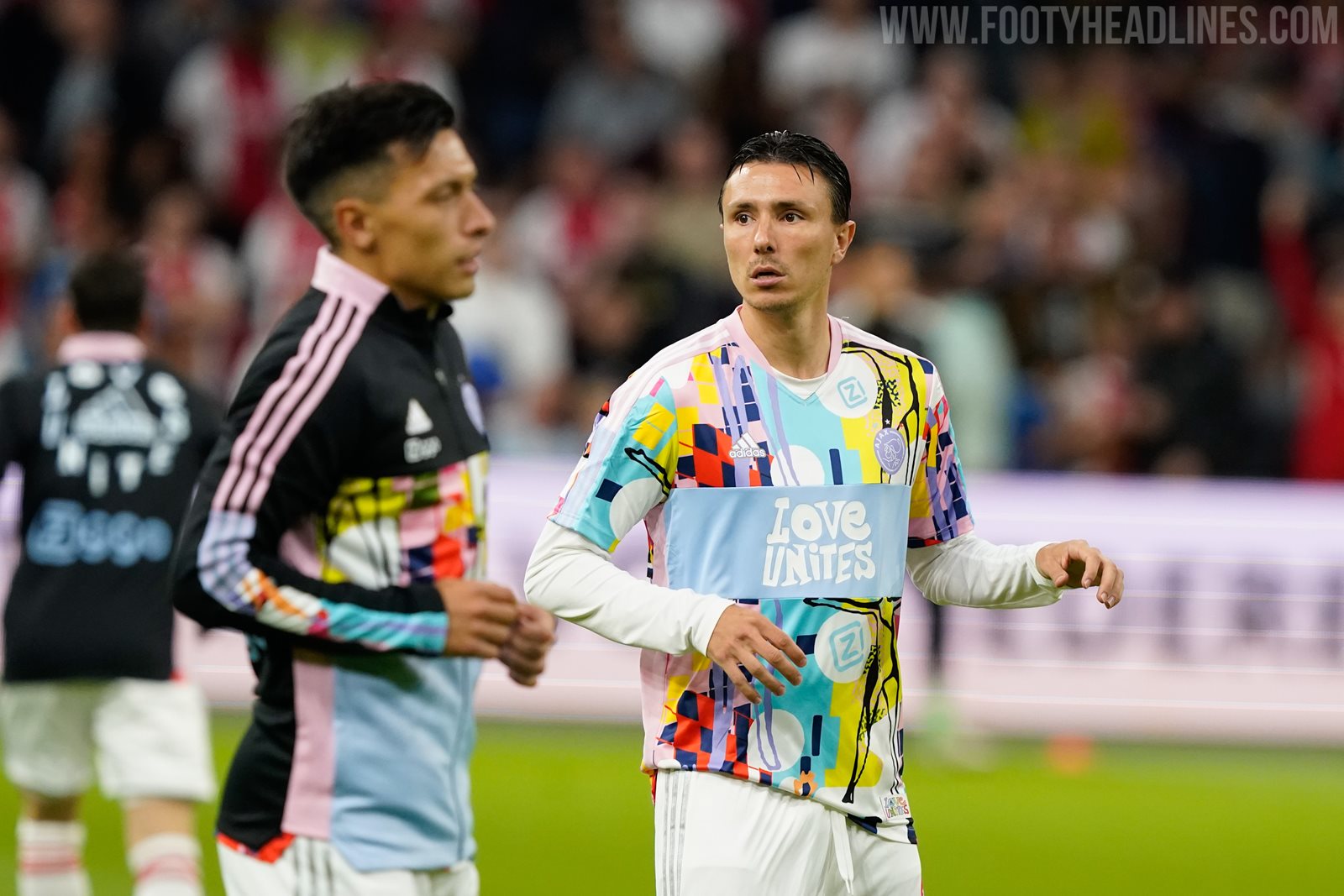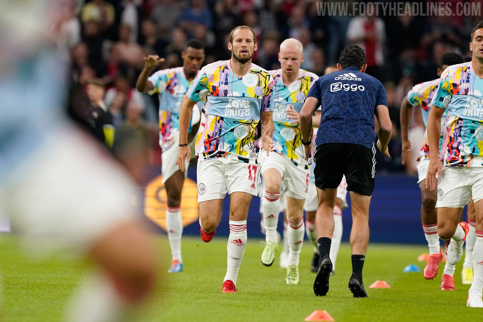 Um 25 Jahre Amsterdam Pride zu feiern, wärmte sich Ajax vor dem Spiel gegen den PSV am Samstagabend in speziellen Adidas-Trikots auf.