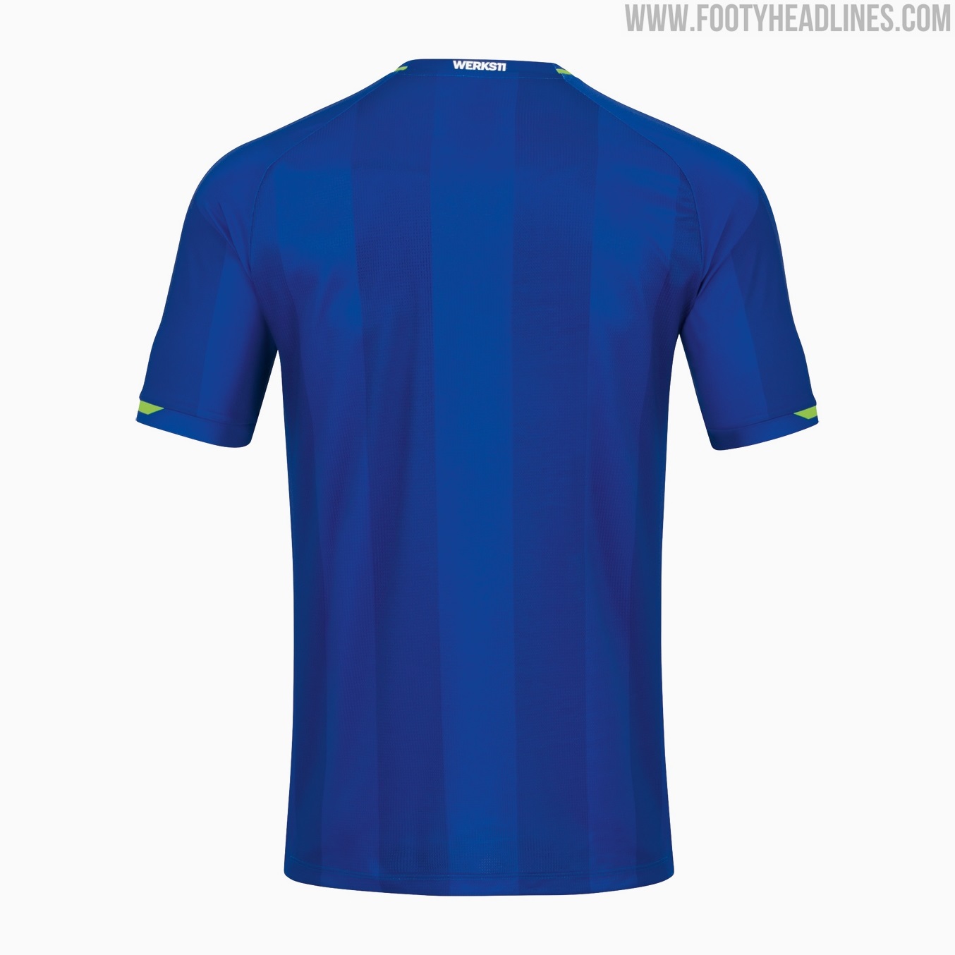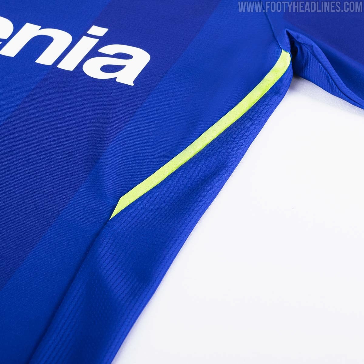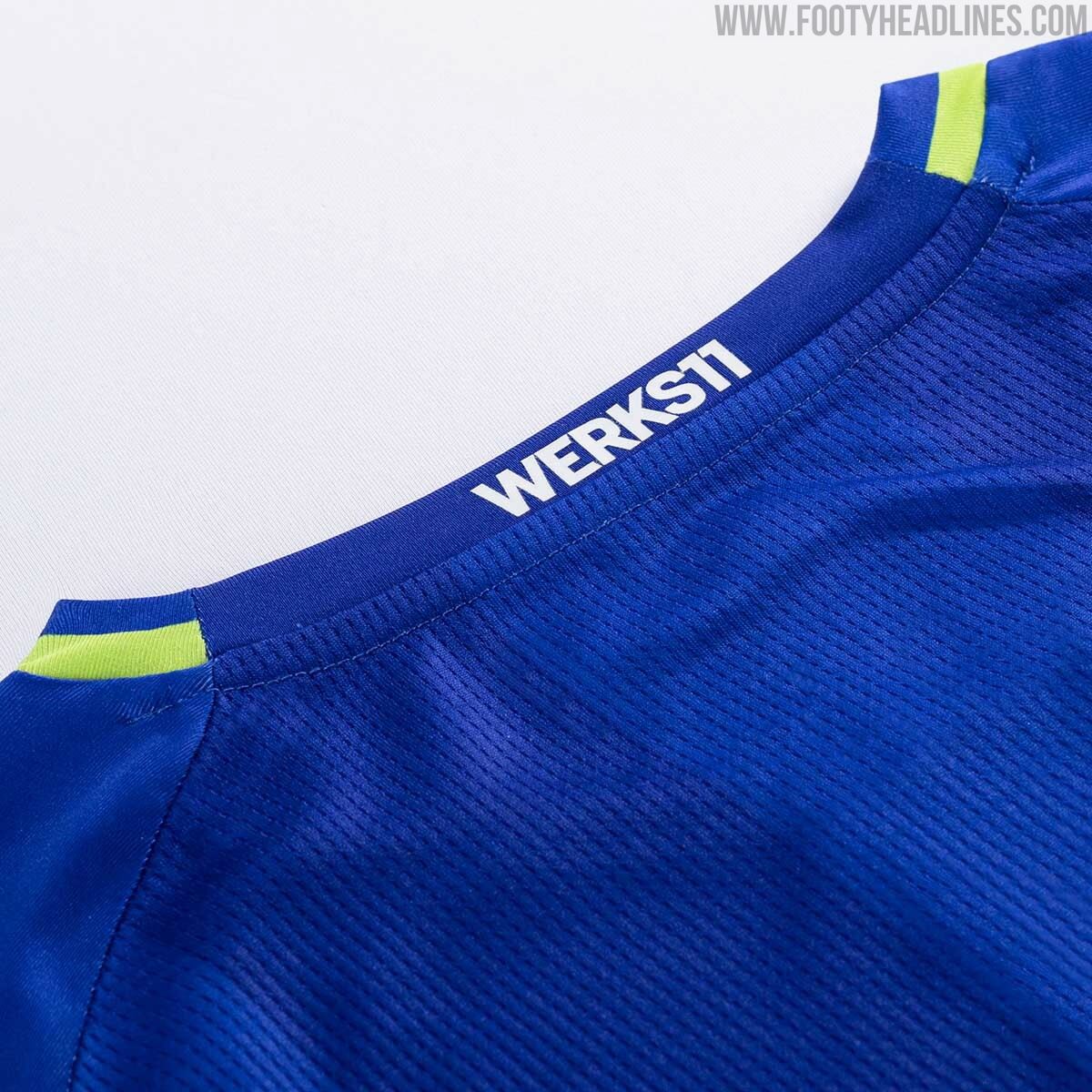 Grüne Akzente finden sich an den Ärmelbündchen, dem Kragen und den Seitenteilen, während die Sponsorenlogos weiß sind, einschließlich einer zweifarbigen weiß/blauen Wiedergabe des Vereinswappens auf der linken Brust.